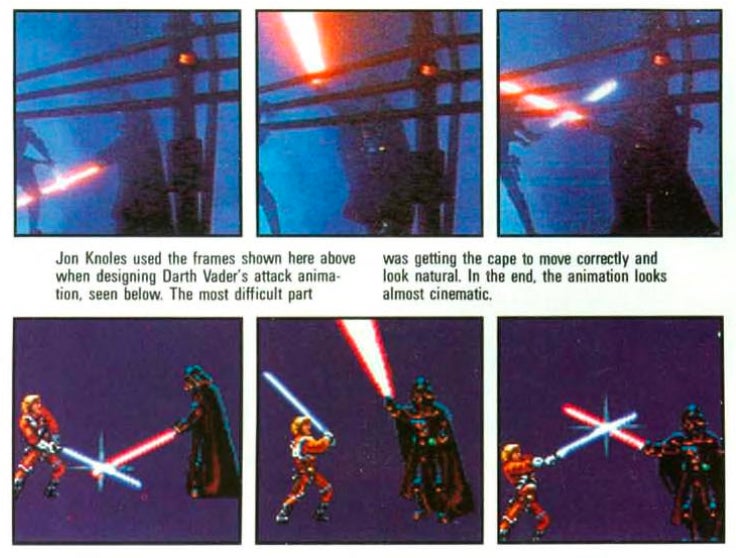 The Empire Strikes Back's best-known setpiece is Luke's first ever duel with Darth Vader, a beautiful multipart battle that takes them through the bowels of Cloud City and ends with Darth Vader's famous reveal: "No, I am your father." In the September 1993 issue of Nintendo Power, LucasArts developer Jon Knoles discussed the process of capturing that famous battle, juxtaposing the animations in the game with actual scenes in the movie. The hardest part to get right? Darth Vader's cape, apparently.