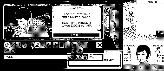 That number surprises me—200—knowing that the version of the demo I got is not the same as what others got. There's a lot of surprising replayability with that number, especially considering the five mystery scenarios starring different characters overall and the many combinations those can take. It reminds me of another card-based game from this year, Cultist Simulator. Cultist Simulator takes an opposite but similar approach to World of Horror. Essentially, Cultist Simulator is more of a pure adventure game, only it's given a very loose structure in being a card game. The two games are kind of like two sides of the same coin; one uses card games as an inspiration for its backbone, while the other literally uses cards as a means to add a random element and usher its many stories forward.