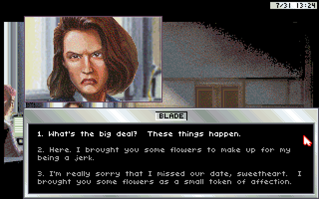 Rise of the Dragon was my favorite of the two games for its believable, convincing dystopian near-future setting. I also appreciated the sheer level of detail in the game -- there were a ton of things to discover just in the protagonist's apartment if you'd poke around a bit, and there were generally several different ways to solve the various problems you'd come across. There were also real consequences for your actions; fail to placate your girlfriend Karyn early in the story after standing her up, for example, and it would make your life a whole lot more difficult later.