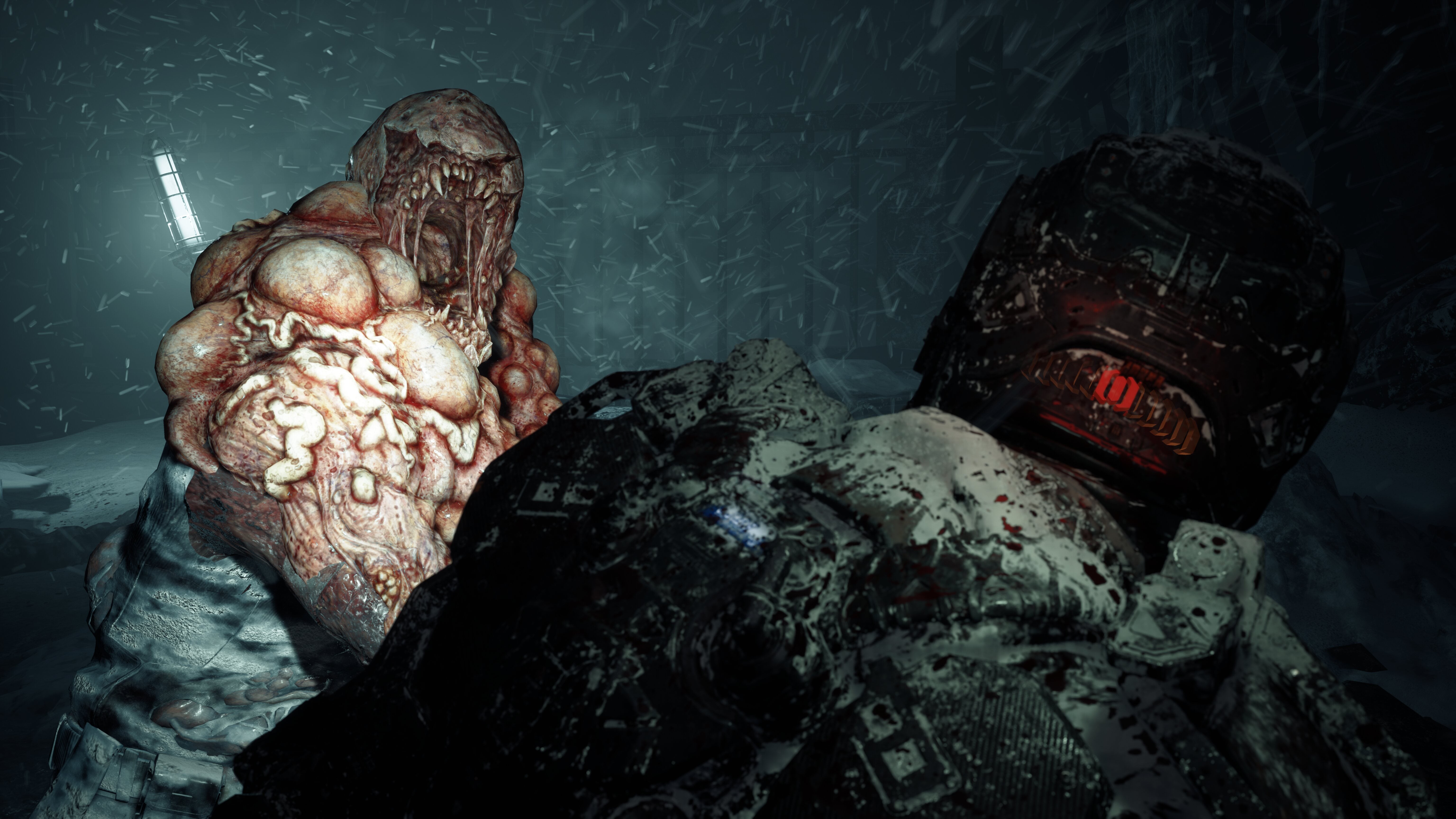 Simple puzzles tug you away from the golden (or red) path, but you always have a through line telling you where you need to go that you can come back to if you get spun around. It’s less invasive than Dead Space’s objective marker line that Isaac could summon from the palm of his hand on a whim, and more in-keeping with this horrible, brutalist-industrial world. Veering from the path might reward you with a clip of ammo, but punish you with another tentacled ghoul intent on sucking your brains out through your eye. Is the trade-off worth it? It’s up to you.