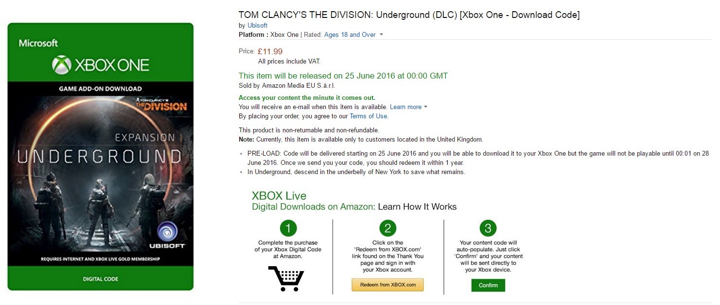 We already knew that the first expansion for The Division would be released in June, but it looks like listings on Amazon UK and Amazon Germany have spilled the beans on the release date for the DLC on Xbox One.