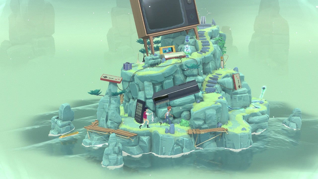 There is no dialogue in The Gardens Between, only vignettes of memories that you catch a glimpse of after completing a level. The islands hold things from the memory you're working towards, like discarded video game controllers, keyboards, fossils, obsolete technology, and so on. In one level, you use the numeric section of a keyboard to punch in a code that's visible elsewhere in the level, but you have to be careful in entering it because your two heroes always jump on the same two numbers when they hop across it, so utilizing the rewind and fastforward is essential to calculate the right output and unlock the puzzle's next step.