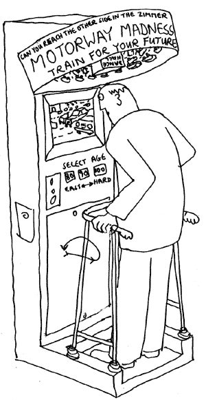 And there's one game in Hunkin's collection that's delighted me as much as anything I've played this year. Mobility Masterclass is cute enough from the off -- featuring a walking frame attached to a cabinet, you must shift it at just the right time in order to cross a carousel of traffic, rendered by lines of models filmed and presented on a screen in front of you.