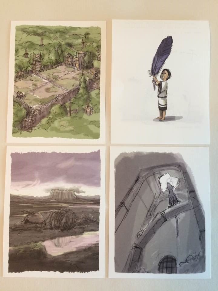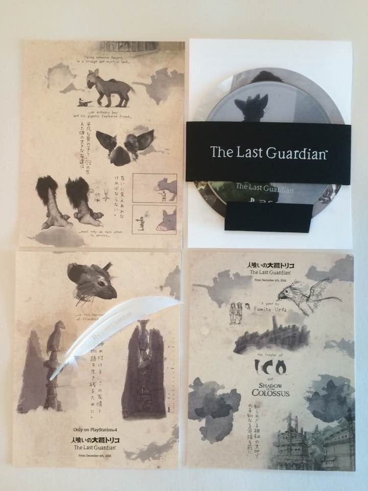 Opening that folder reveals both main characters in a detailed pop-up image, and lifting a flap beneath that holds the game, a folded note from Ueda, a number of postcards with sketches and a feather with the title of the game scorched on it.