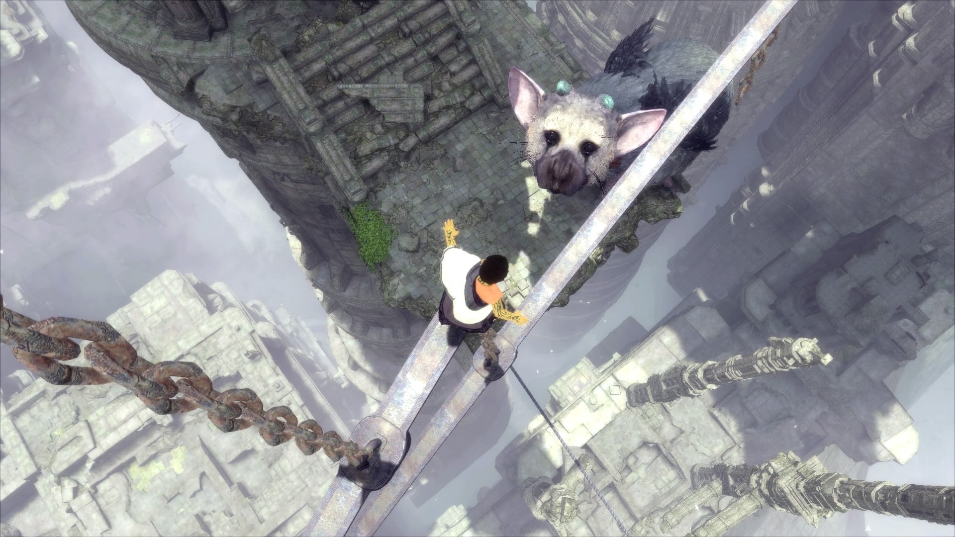 Carefully shuffle down the chain links to get to Trico. Carefully!