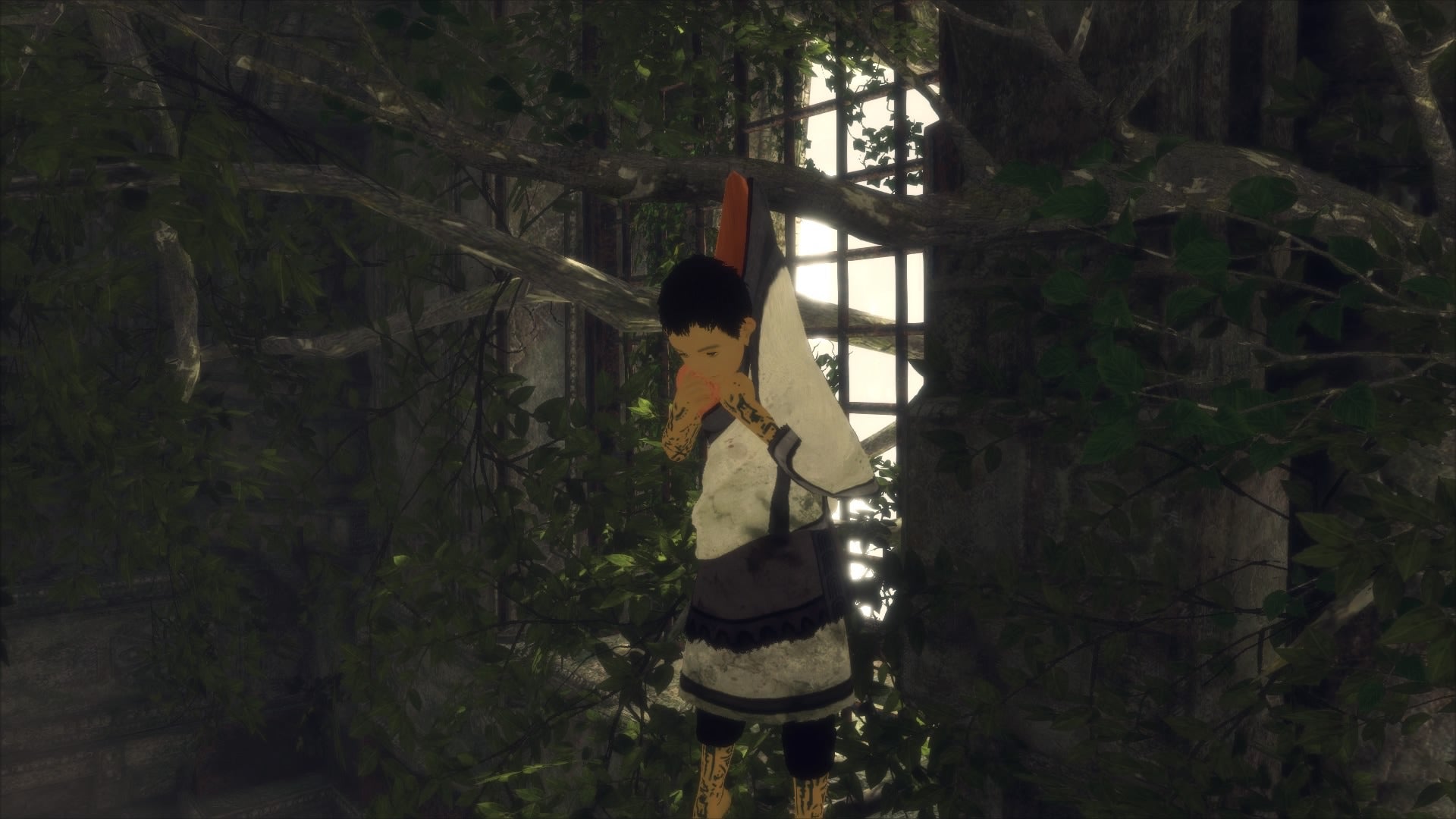 Head over to the locked double doors and onto Trico's back. You can climb up to a window without bars here.