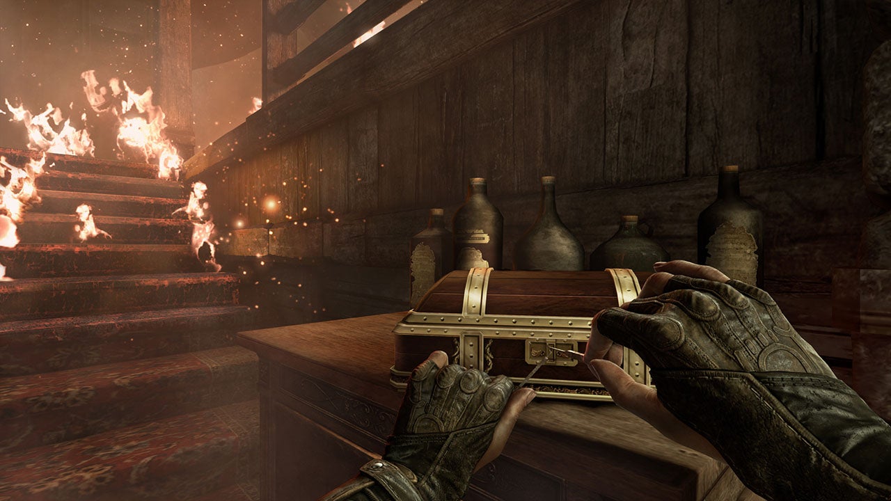 I don't know exactly how previous Thief games worked, but the City plays the role of hub in this sequel. It's a massive, winding labyrinth of cobbled streets, rickety platforms, and obscure walkways that branches off into standalone missions set at its periphery; the eight chapters of the story transpire in self-contained spaces connected to but not really a part of the central hub. The environments in these main chapters possess a different feel than the core City, adopting a more linear style – sometimes there are even quick-time events and big Call of Duty-style explosive cinematics to contend with.