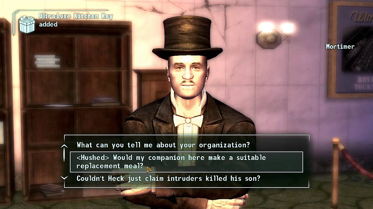 The gangs inhabiting the strip further embodied this vision of Las Vegas. The Omertas represented the real-life mobsters that ruled Vegas in the 50s and 60s; the Chairmen represented all the denizens of the Strip wanted to look cool but were really just trogolodytes, and the White Glove Society was pure vice. As always, the apolocalypse was meant to strip away the real-world location's glossy exterior and reveal the rot beneath, with a particular emphasis on Vegas' greed and excess (indeed, one of the original working titles for Fallout: New Vegas was "Fallout 3: Sin City").