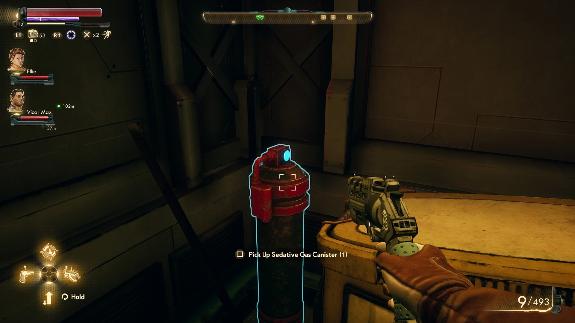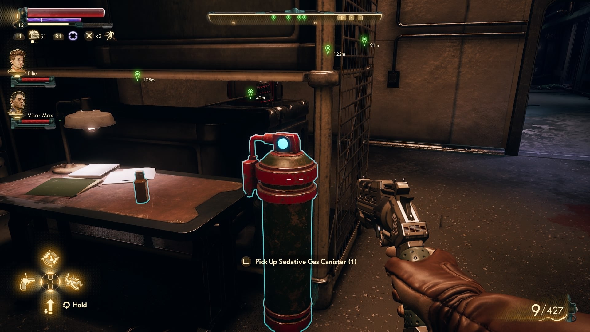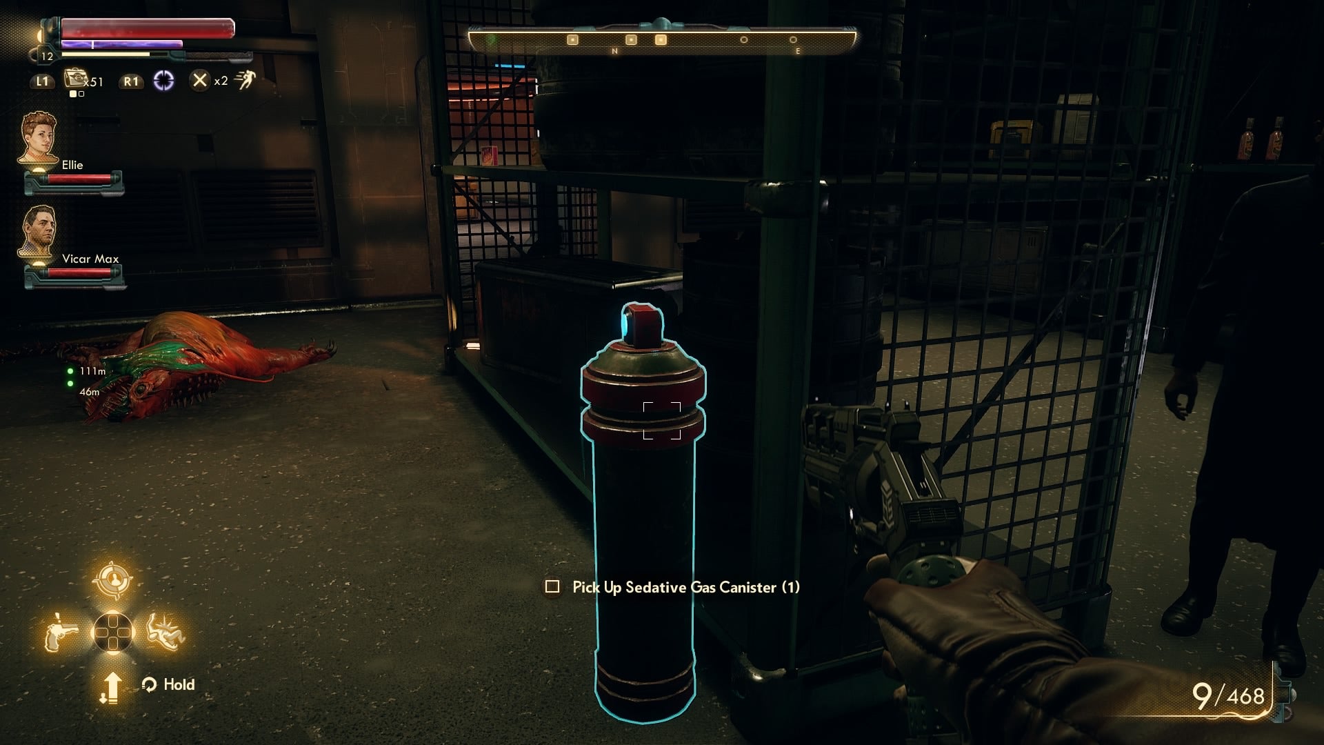 You now need to search the two storage rooms on the south side of this floor for “Sedative Gas Canisters”.