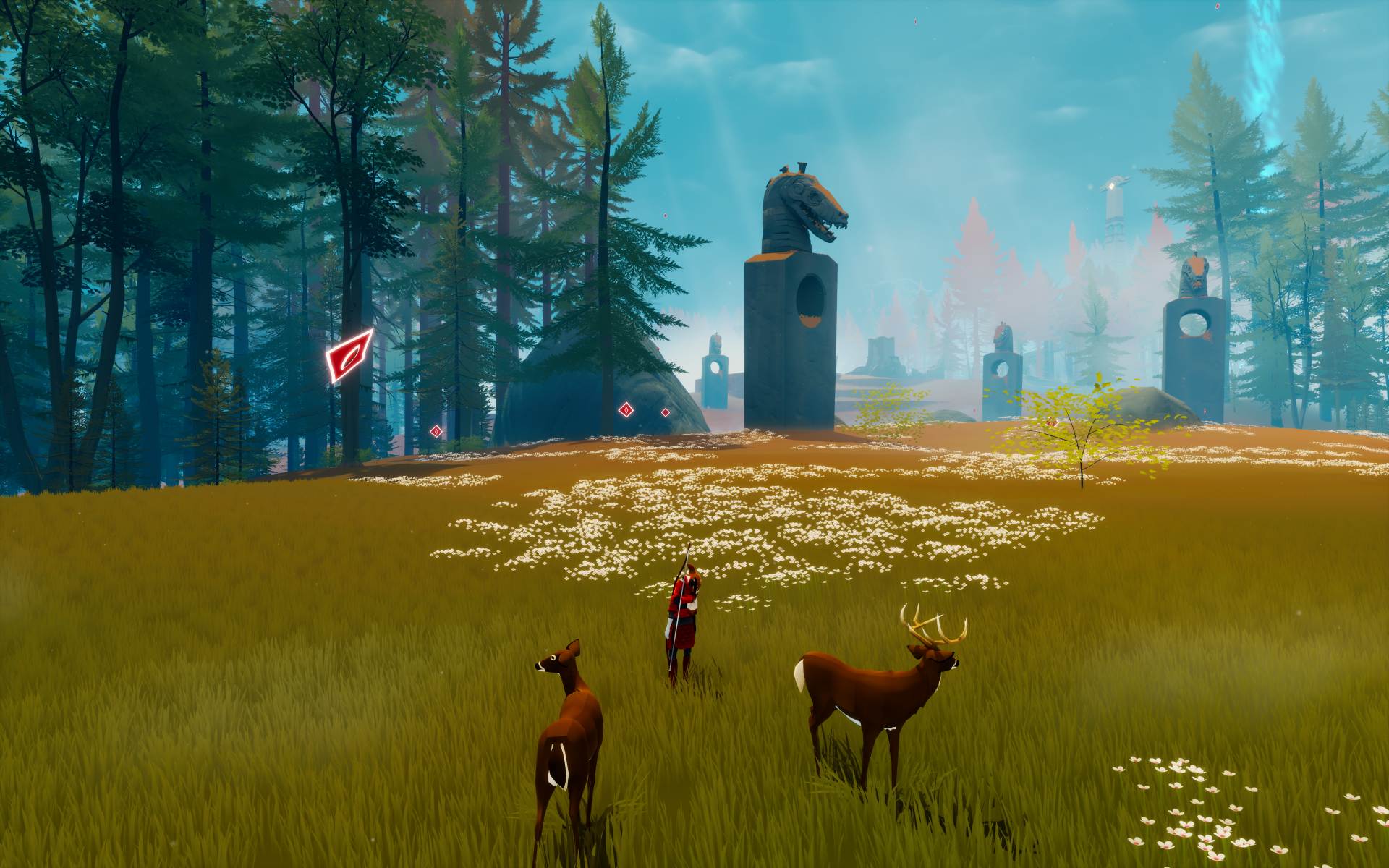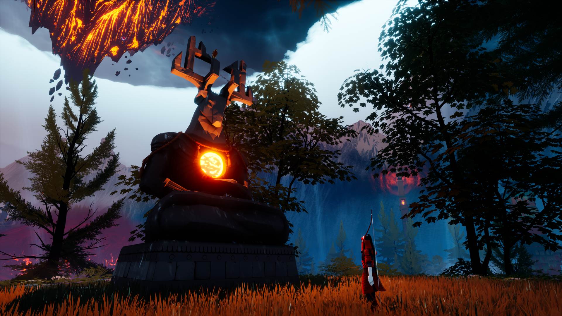 With all this movement, it makes sense that the world of The Pathless is fairly large. It's bigger than Abzu, and separated into different areas by plateaus. Scattered around are key objectives for progression—the gems and towers that let you cleanse the god-animals—but also a number of optional puzzles and challenges. These reward you with more crystals that go towards your eagle companion, eventually boosting its flap charges.