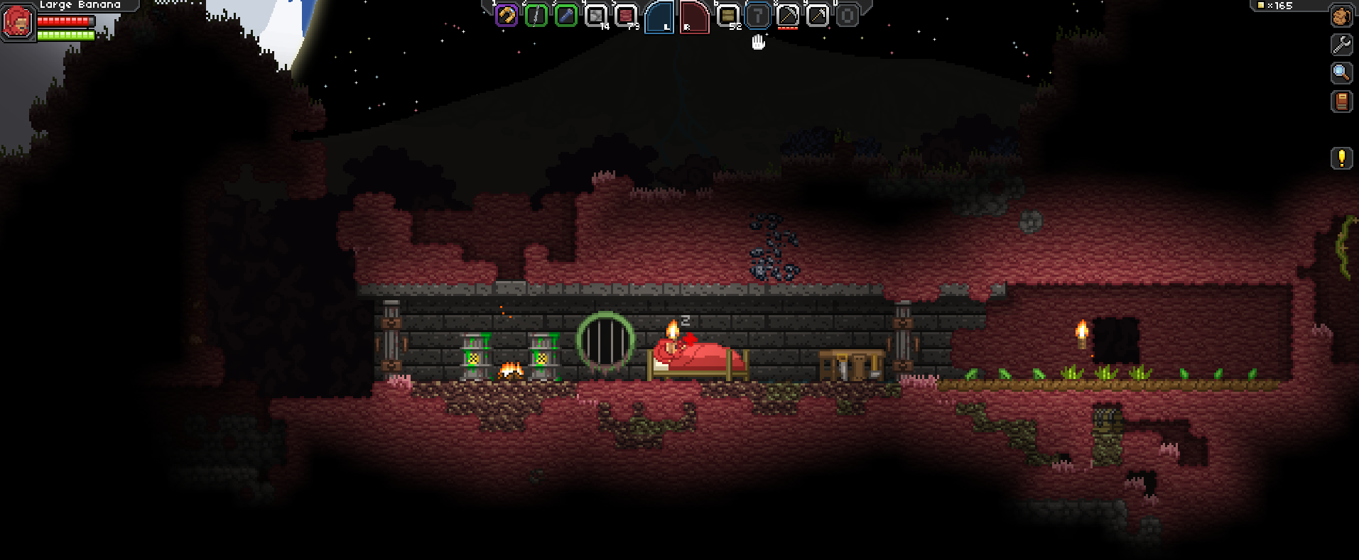 So, I set up a basecamp, furnishing the innards of the sewers with a bed, a hearth, a work bench and a camp fire. The section where the chest was once located is paved over, the soil tilled and populated with banana seeds. The day slowly dwindles into night and a gibbous moon rises. I put Large Banana to bed. Sleep. Ssh. No tears, only dreams now. Ignore the crawling, hungry albino monstrosities throwing themselves at the wall a few pixels away.