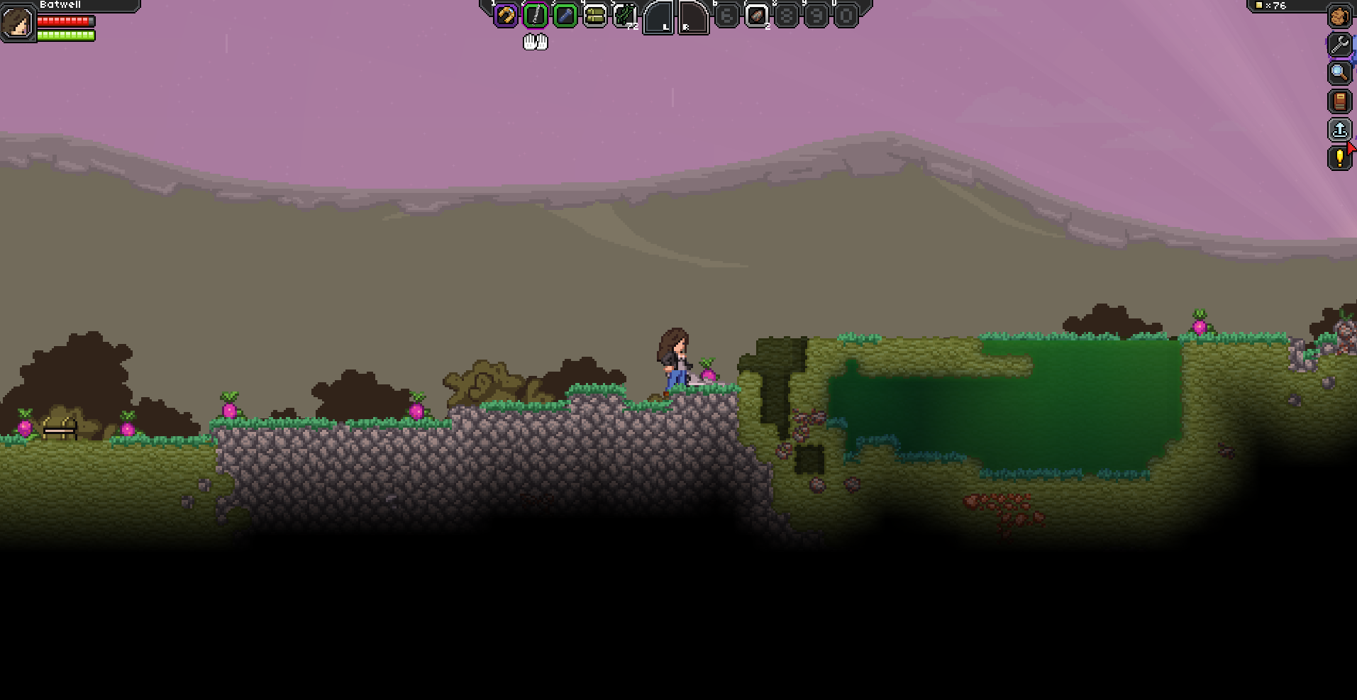 On the bright side, however, Batwell does end up landing between a pair of be-tongued toxic chests. They make a face at her as we ransack their insides: 100 pixels, a blueprint and a medkit. After ransacking the chests, I go back to trying to figure out what to do. The starting area is fenced in by ominous pools of toxic waste too wide to scale. If Batwell is going to do something with her life, we're going to have to move out of here. With some amount of trepidation, I make her veer towards the slightly smaller body of undrinkable water. I break off a few pieces of dirt from the ground to try to pave over the noxious goo. It almost works. As Batwell run across the makeshift bridge, I realize too late I've missed a square. Batwell plummets inside and immediately takes damage. A bird-like thing with fifty eyeballs nested on the top of its skull shows up, possibly drawn by the splashing. I make Batwell whip around, broken broadsword unsheathed, ready to put up a fight. It vomits a cone of flames and --