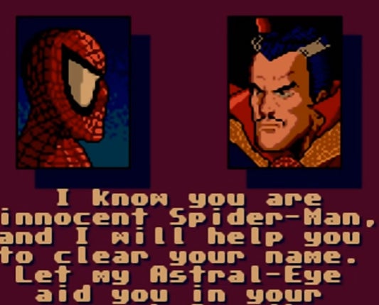 The Amazing Spider-Man vs. Kingpin will be known to most retro players simply as "Spider-Man" for the Sega Genesis/Mega Drive, Master System, and Game Gear. While Strange didn't appear in the Genesis version of the game, the Master System and Game Gear versions had Strange acting as an advisor to Spider-Man, helping him to find the keys needed to defuse the Kingpin's bomb. Since Spider-Man finds these keys on his own in the Genesis version, it's almost like Strange was just bored and willing to help out.