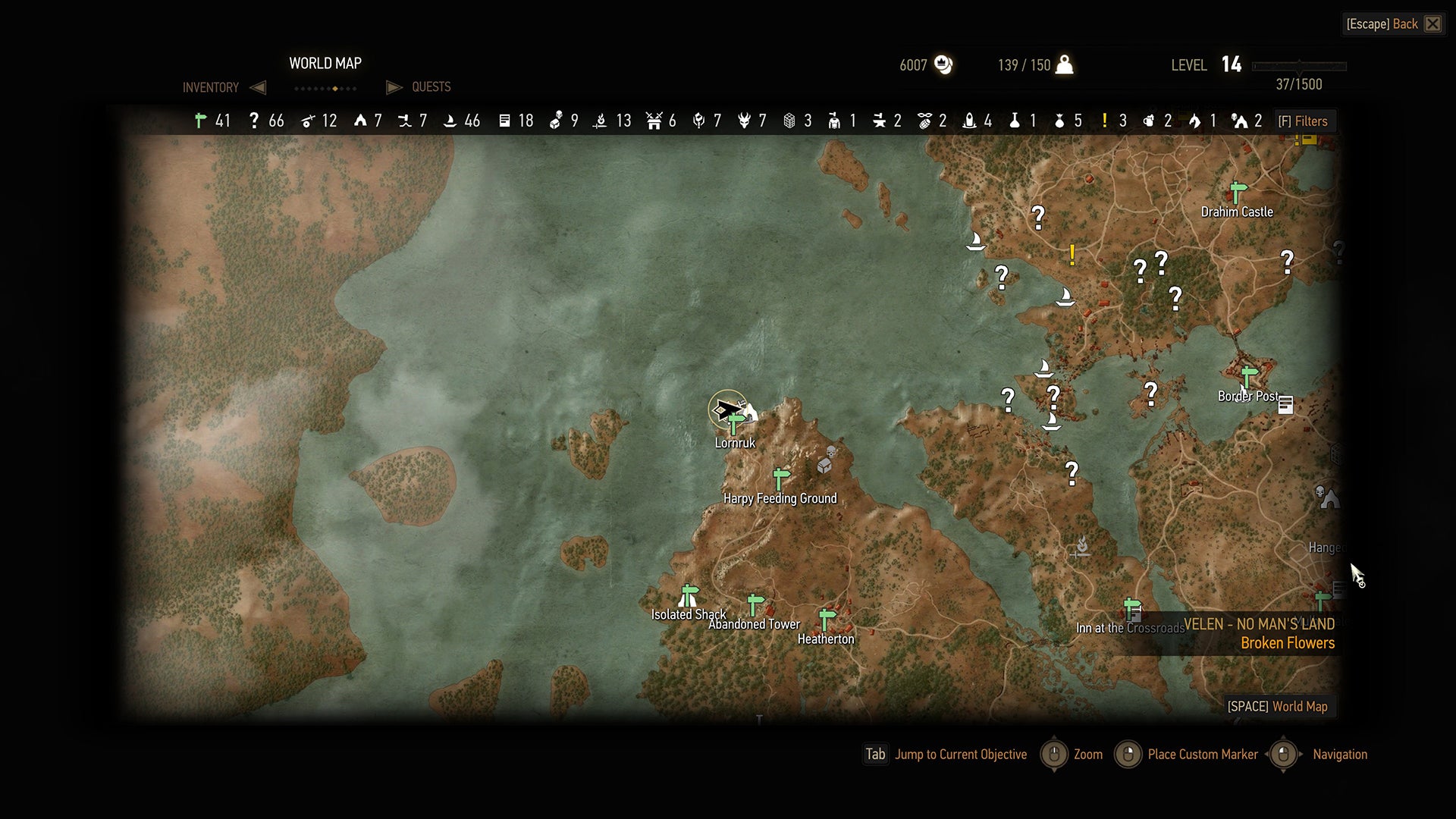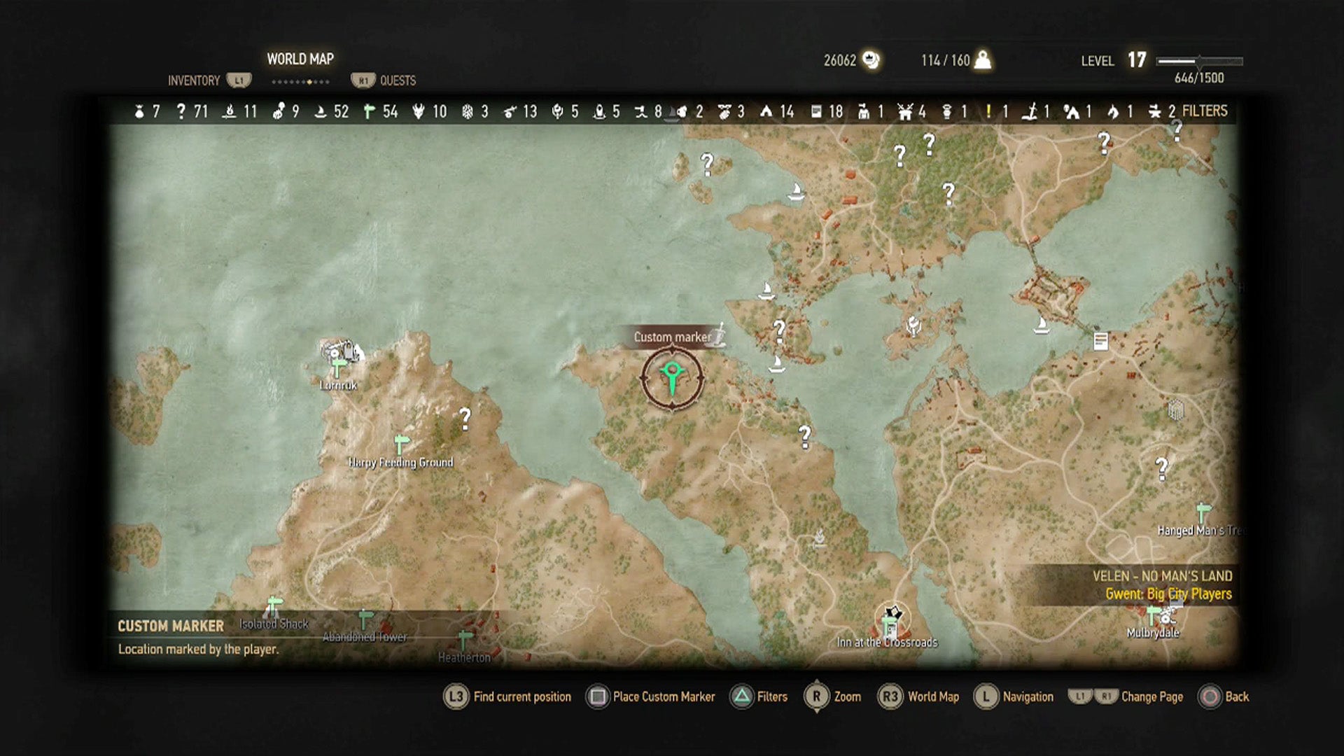 The Inn at the Crossroads sits on an island that’s between two land masses. You’re going to be going to the far northwest shores of the one that is to your left when you’re looking down at the map. If you have unlocked the Harpy Feeding Ground signpost, you can just fast travel there and keep going north.