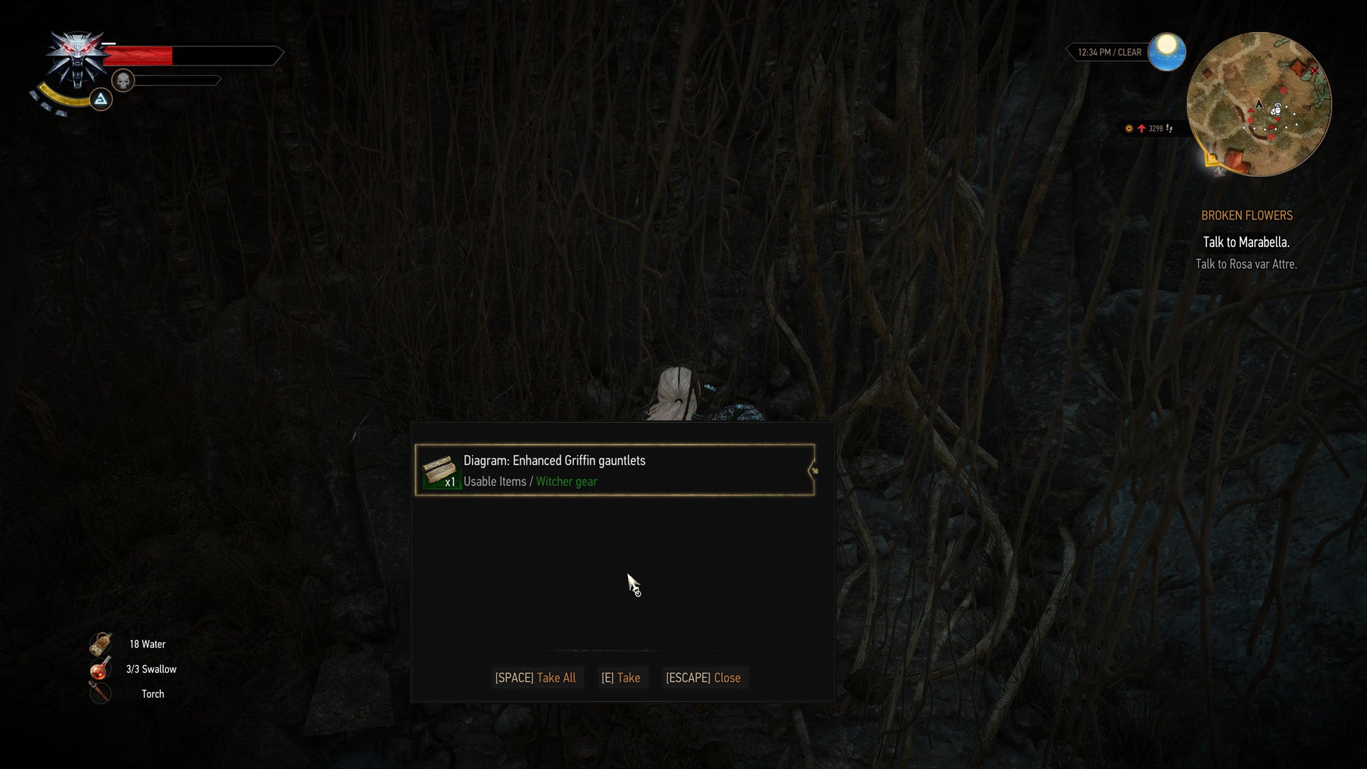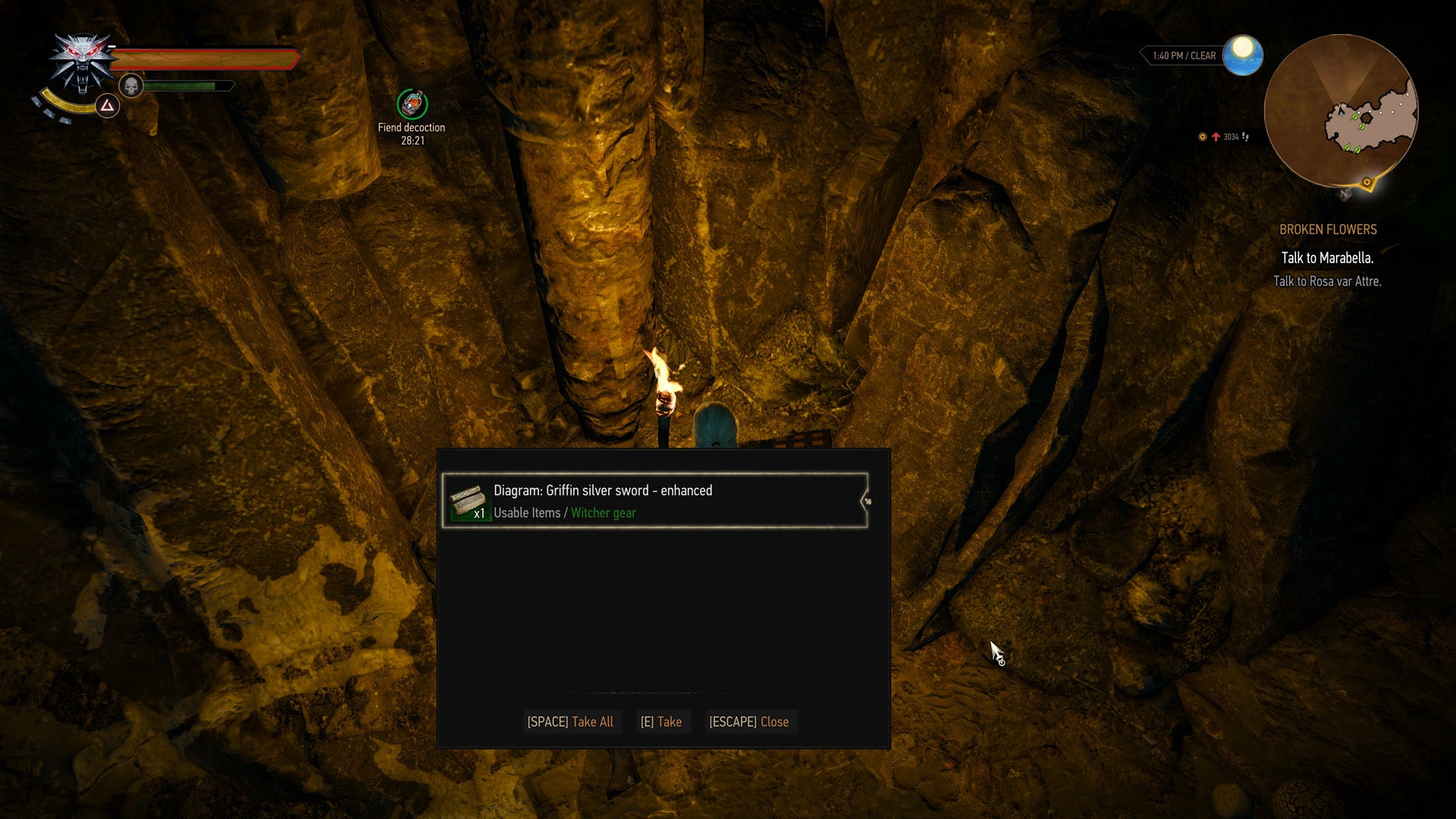 Fast travel to the Crossroads signpost and start heading along the road that runs to the east. Follow it until you reach a cave, going inside and moving all the way to the back. You'll spot the chest with the enhanced Griffin Silver Sword diagram if you use your Witcher Senses.