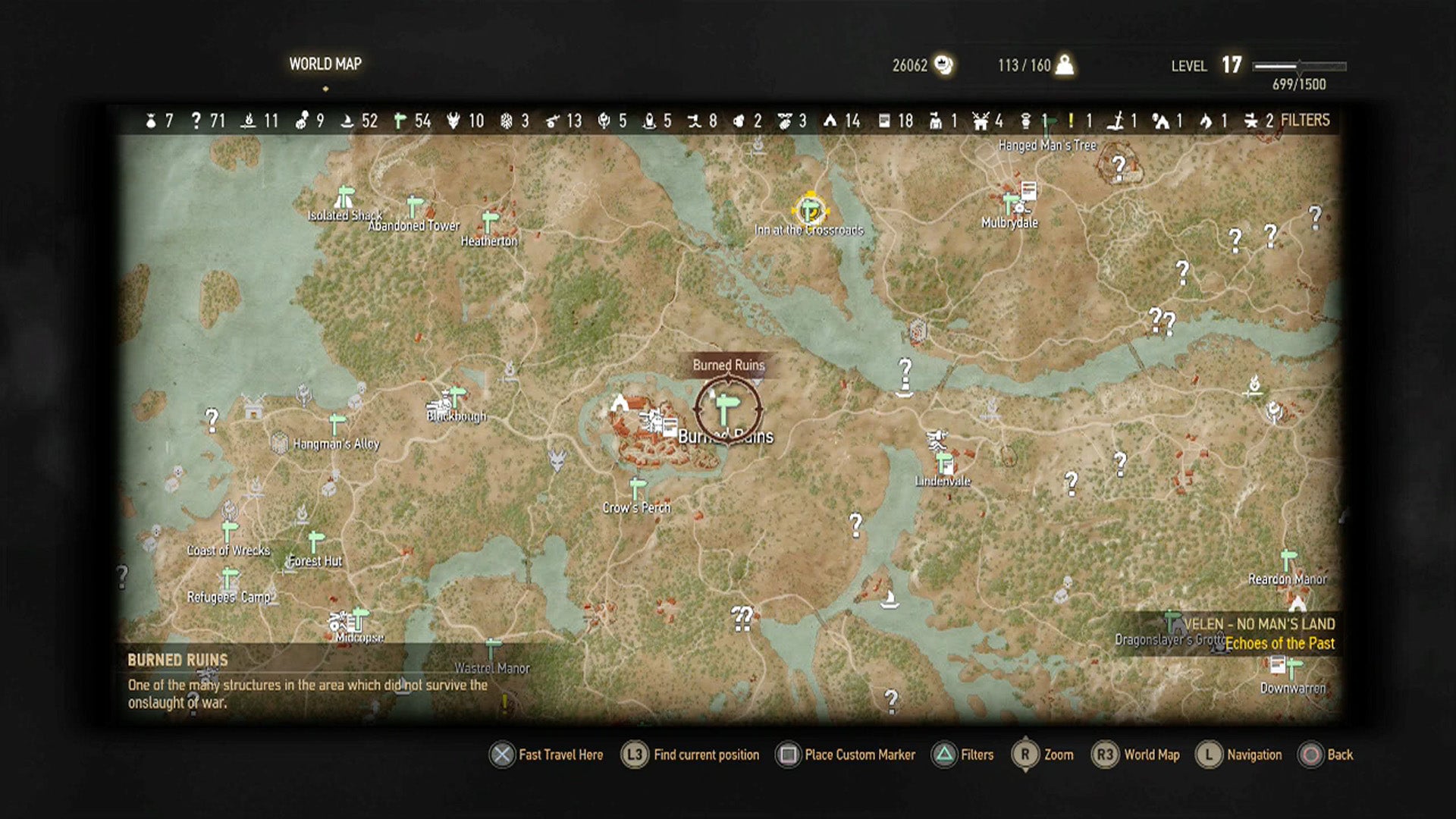 Finally, something easy. Fast travel to the Crow's Perch signpost. If you don't have that, you don't need to be searching for this armor. To the northwest is the Burned Ruins signpost, and that's the location of the final piece of armor for this set. Look for a burned and destroyed building, and inside - under some rubble - will be the chest you're looking for. Try using Aard to clear a path, then snatch the enhanced Griffin Trousers diagram.