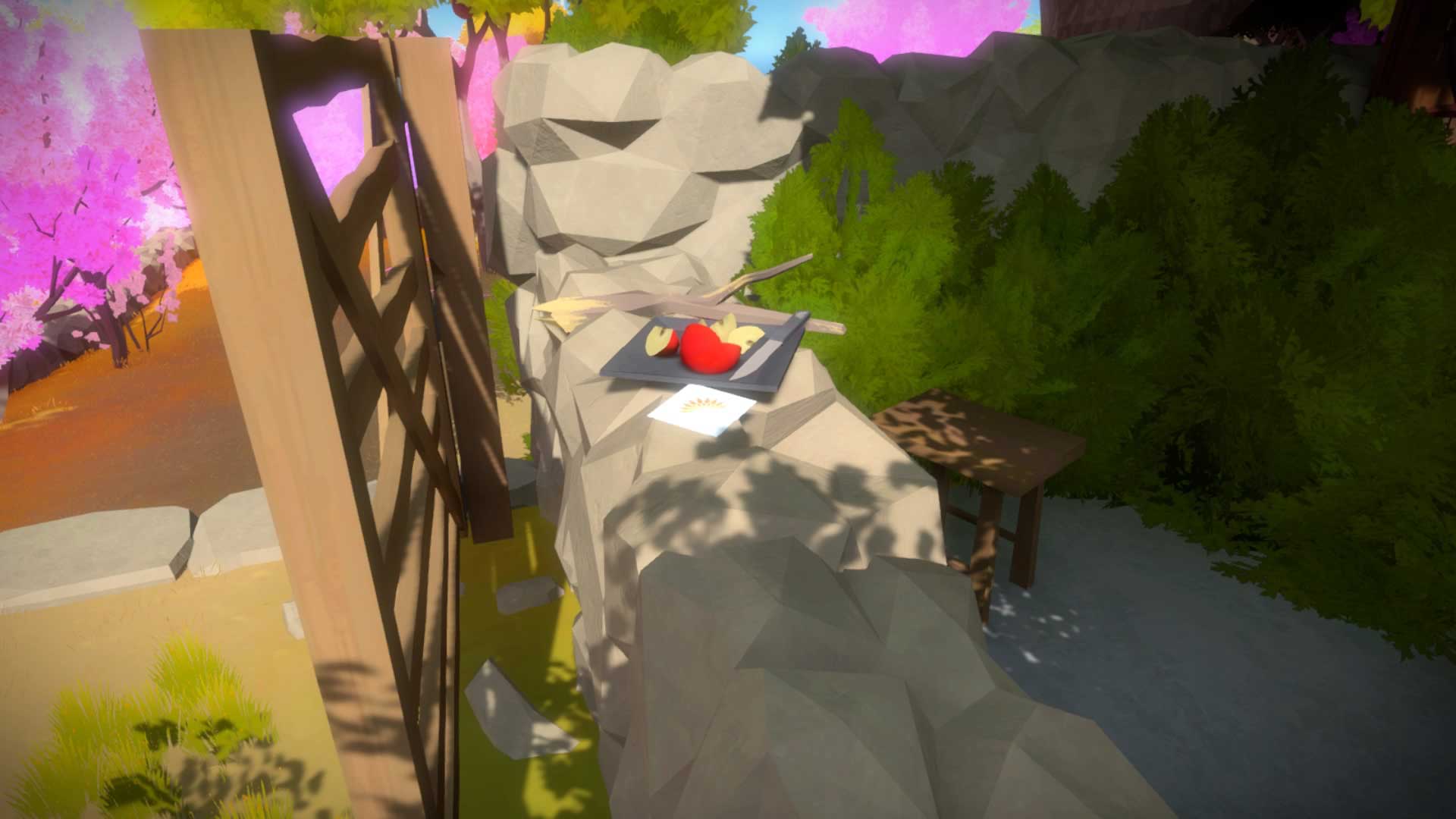 Between the Windmill and the Desert Ruins you'll find a beautiful orchard of pink trees. This peaceful springtime air is at odds with nearby autumnal and summery areas, and reinforces our belief that everything on this island is artifice.