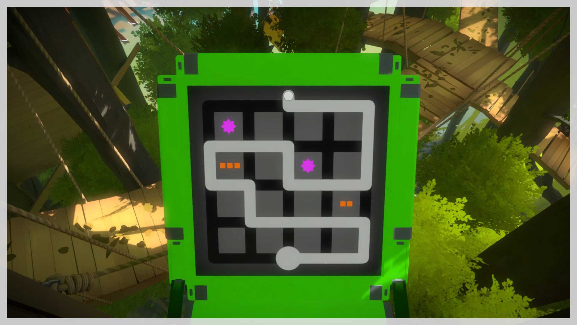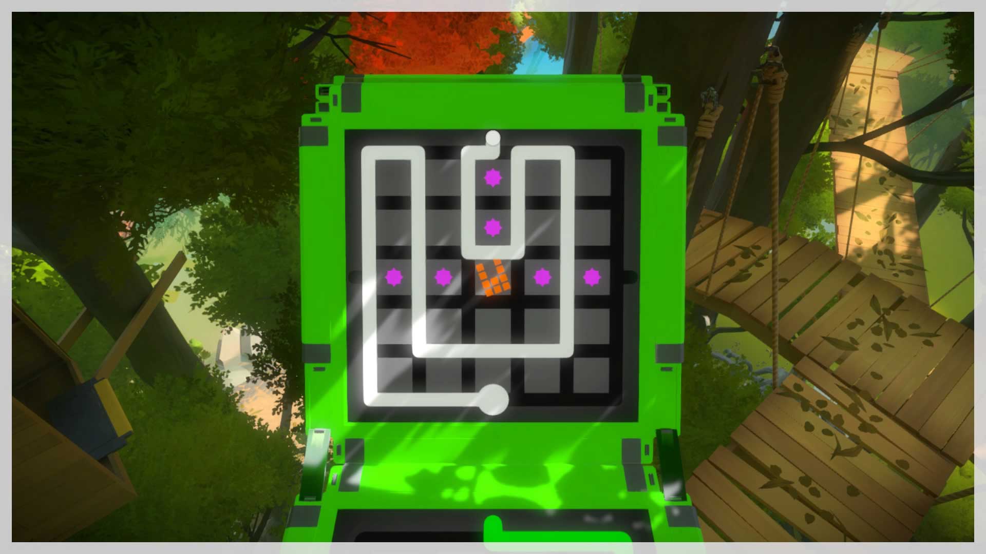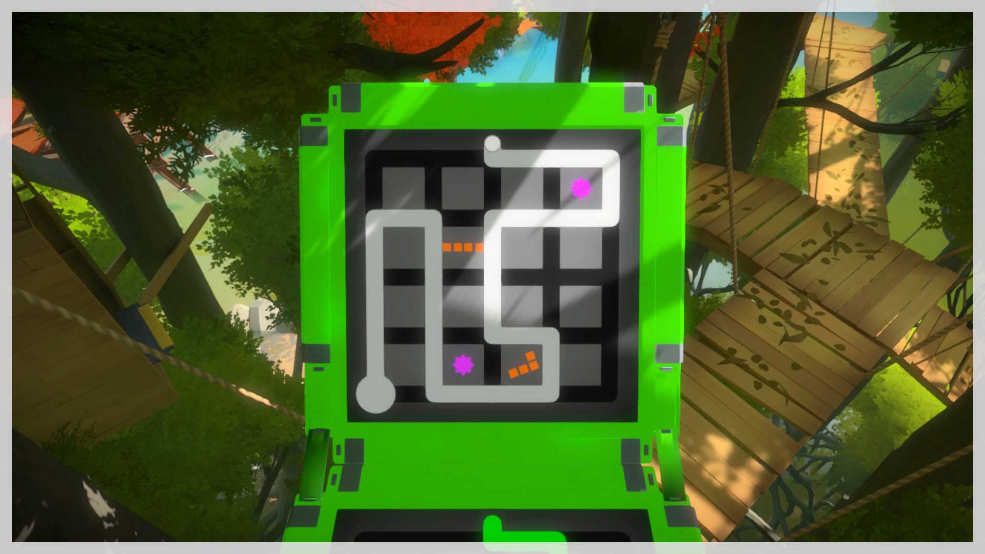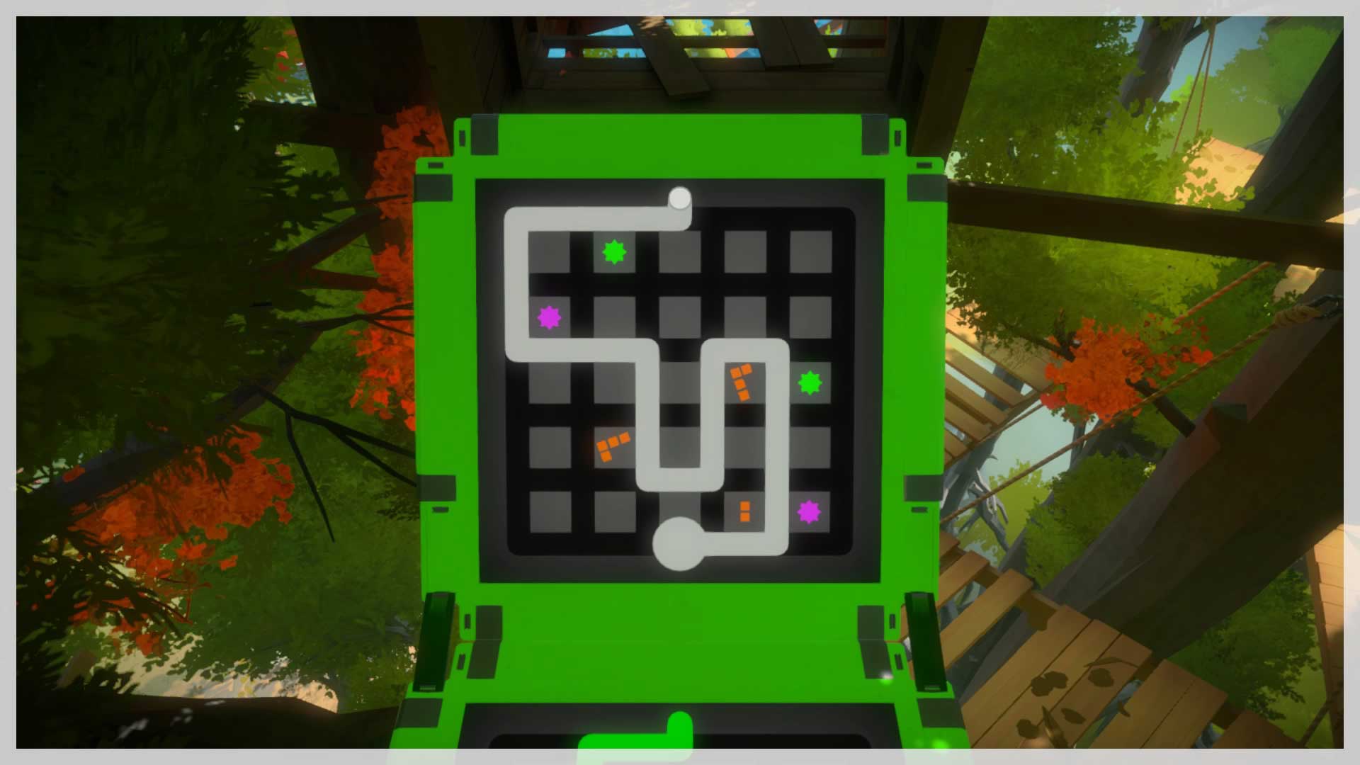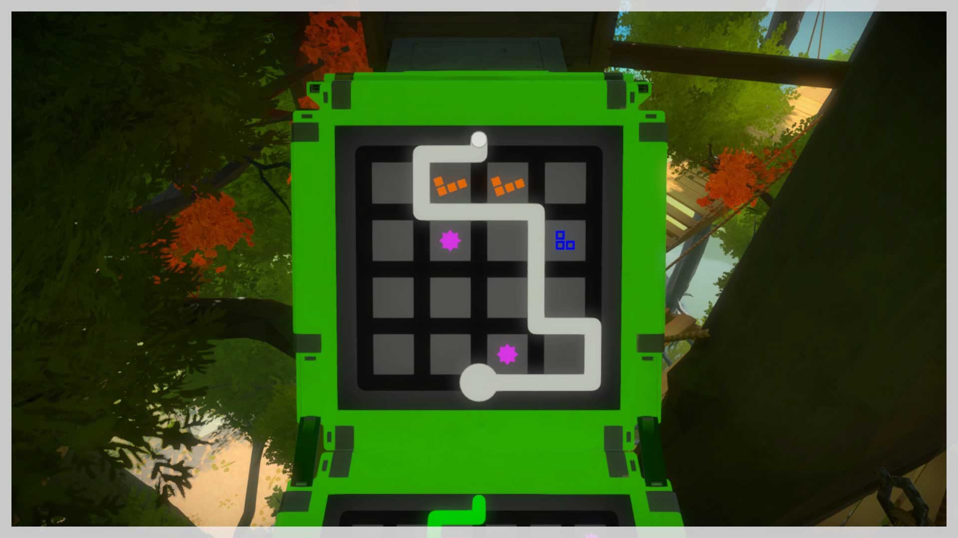 You should only meet one point of resistance on the way; if you can't figure it out, you should go back and do the blue puzzles close to where you exit the walled garden. Anyway, here's the solution.
