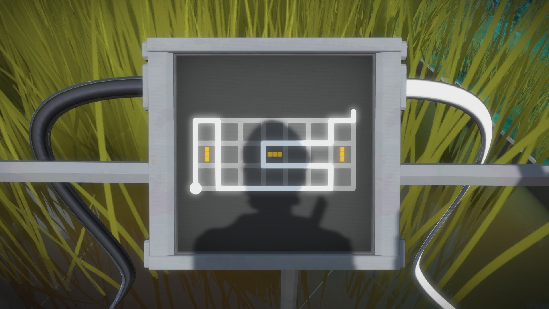 Once you complete the first two sets of puzzles, follow the illuminated wire towards the small bridge. To solve the panel on the bridge, consider the shape of the yellow platforms beneath your feet. This is your clue to the solution. The correct solution will cause the middle section of the bridge to move, connecting you to the other side. Likewise, drawing the inverse of the solution will allow the bridge to return from the other side back to where you started.