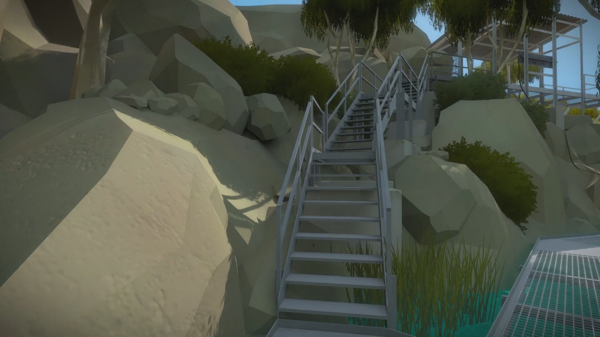 There are three paths to take when you reach the other side of the bridge. Two of the paths are blocked, so the only option is to climb the metal staircase ahead. The four puzzle panels at the top of the stairs contain multiple Tetris shapes that must be sectioned off together in a single outline, without using overlapping blocks. Focus on sectioning off the correct number of blocks, rather than replicating the exact shapes themselves.