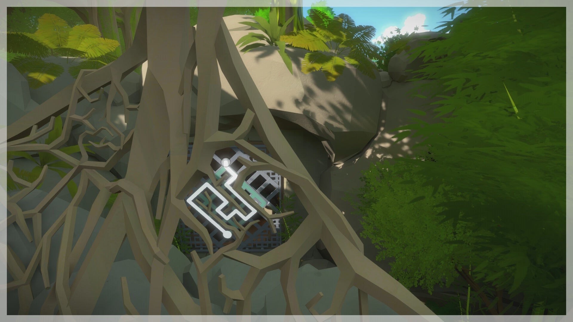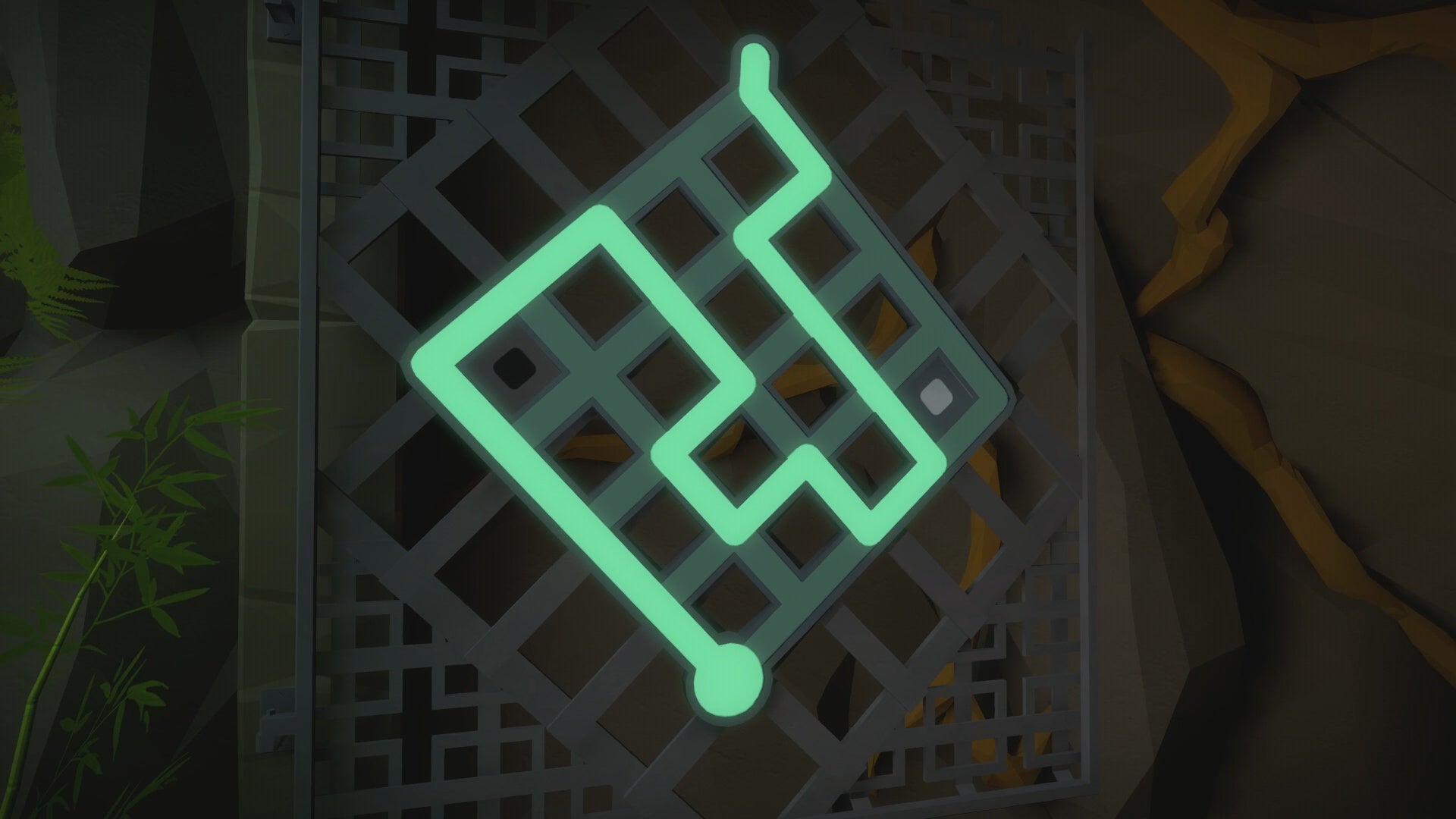 Solve the puzzle panel to the cave gate by using some nearby tree roots up the hill as your clue. Your solution should look like the one below. Enter the cave, and solve the line switch on the box to reveal the hexagon solution.