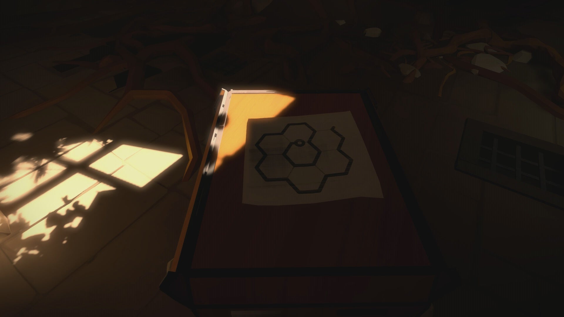 Walk across the rusted ship and locate a staircase on the far side of the shipwreck near its left corner. Enter the broken hole in the wall, and descend down the stairwell to find a puzzle panel on the wall. This panel uses a combination of sound cues and mirroring. It’s tricky, so solve it with our solution and enter the watery chamber. Unlock the box using the line switch to reveal the dark hexagon solution.