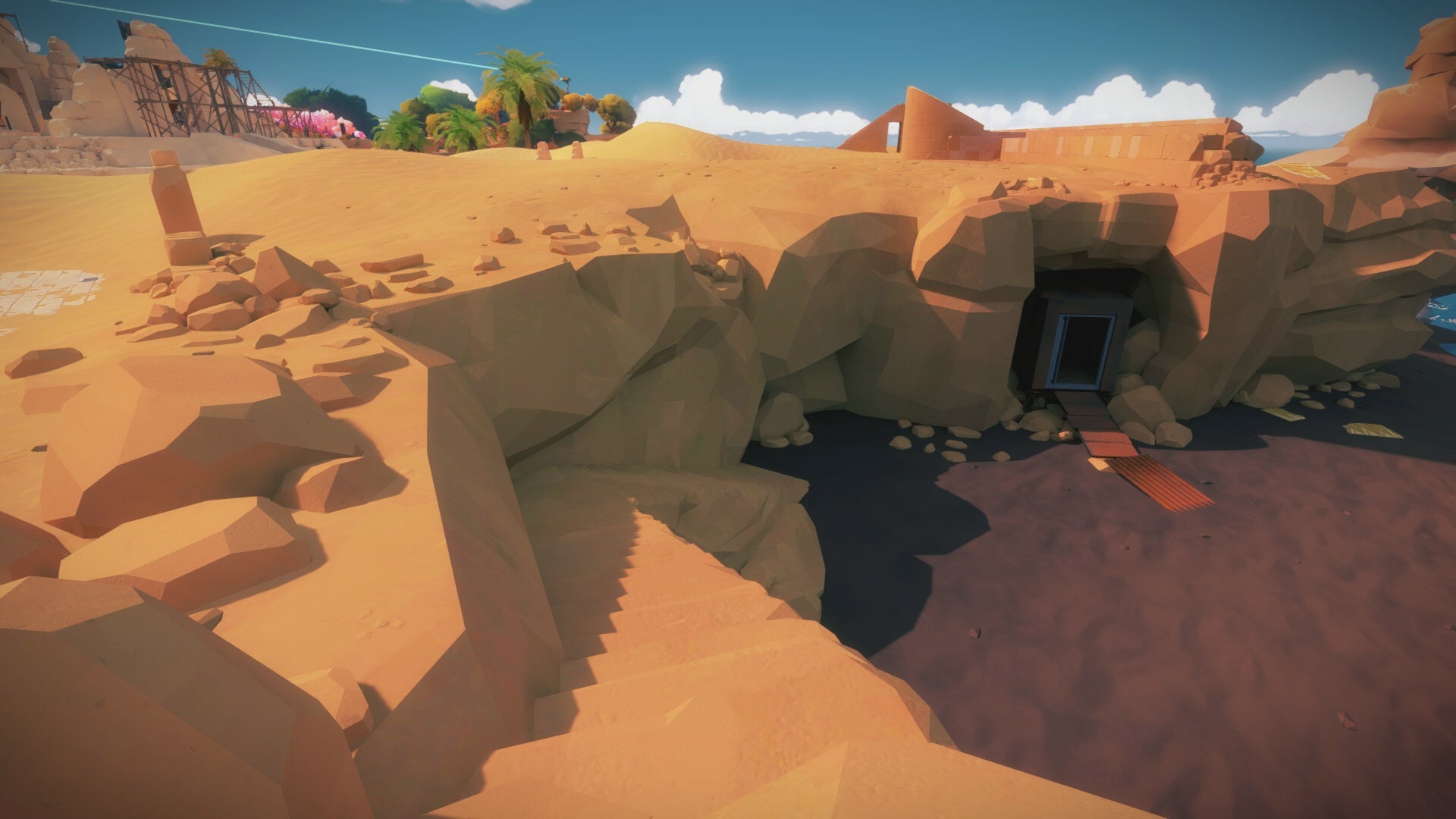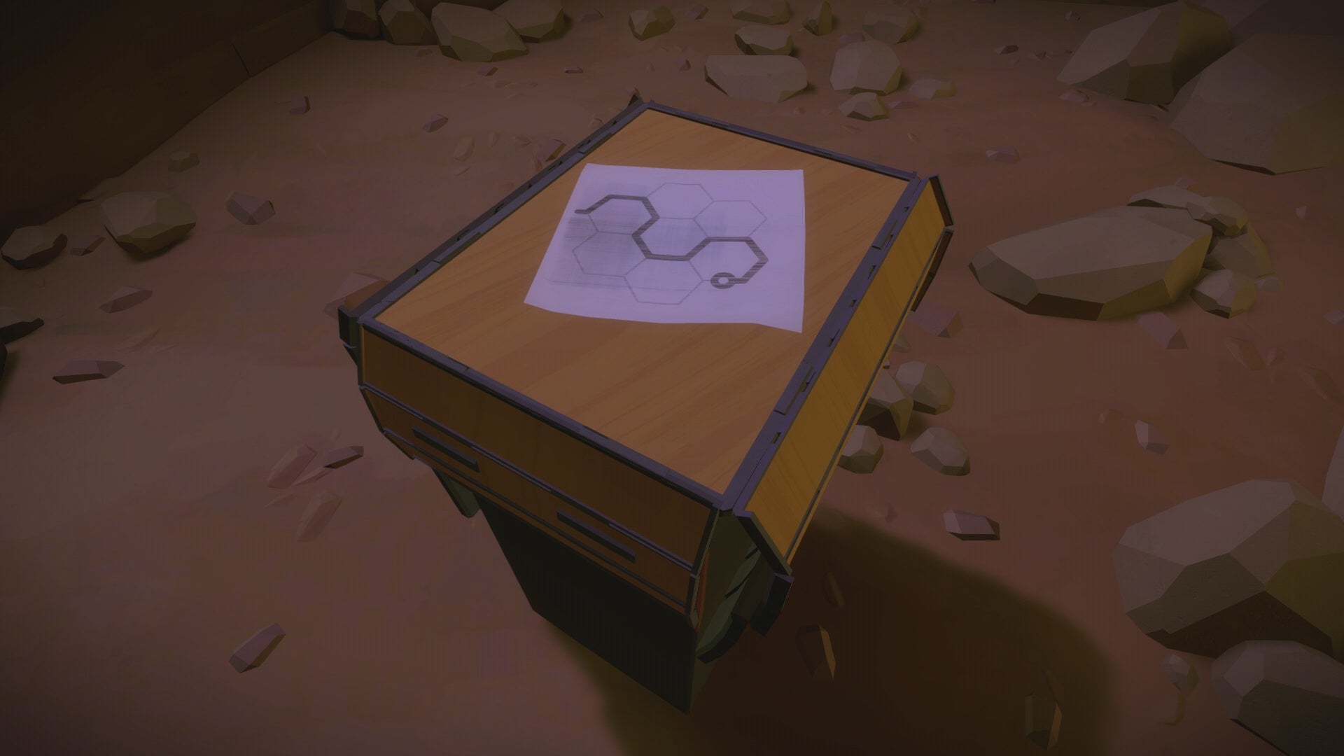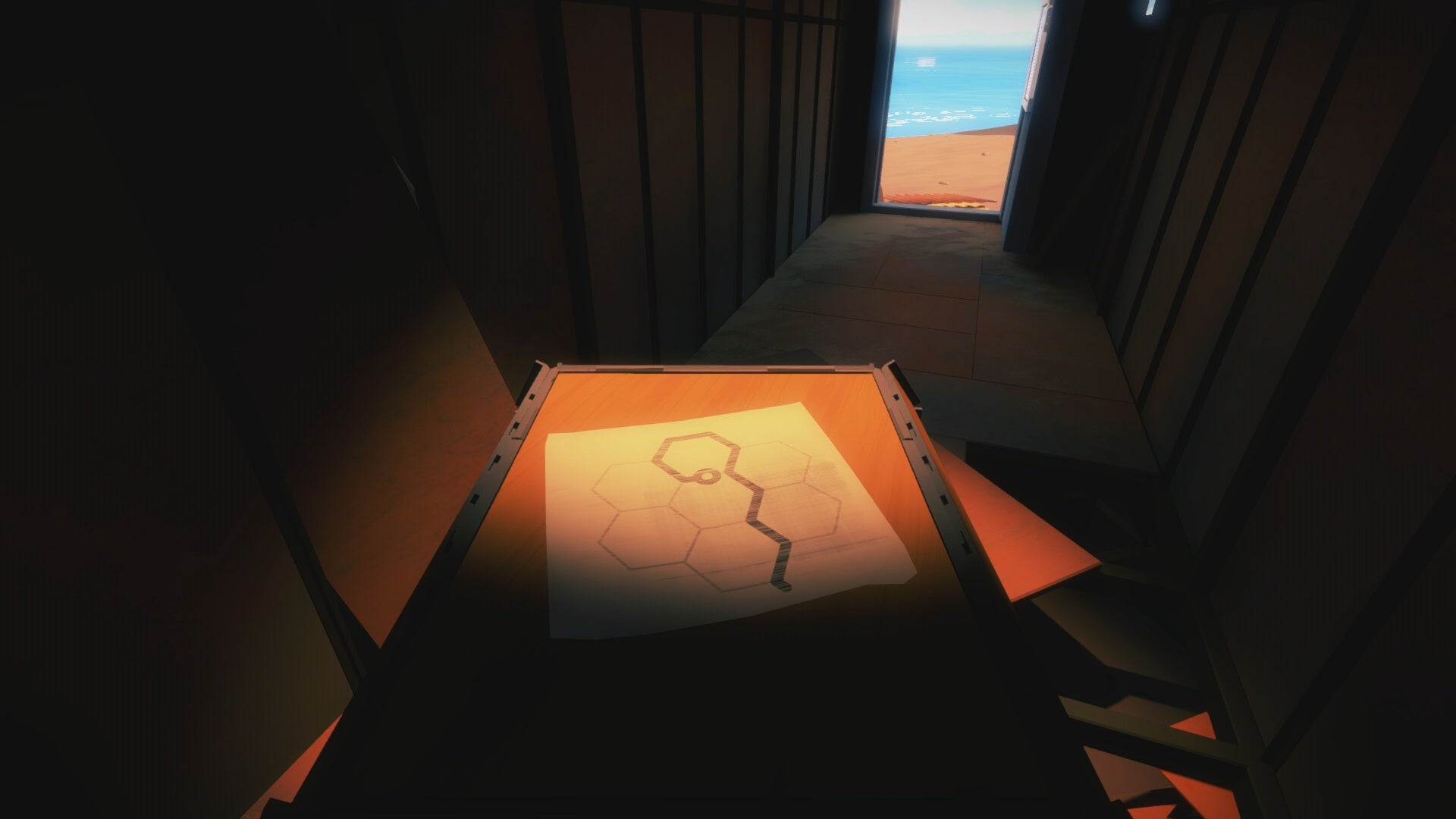 The Desert Ruin is pretty easy to locate, as it is one of the only structures found in the arid desert biome. Go past the Desert Ruin and head toward the shore. Locate a staircase leading down to a door tucked beneath the cliff. Solve the Tetris puzzle using the solution below, and solve the box inside to discover the next hexagon solution.