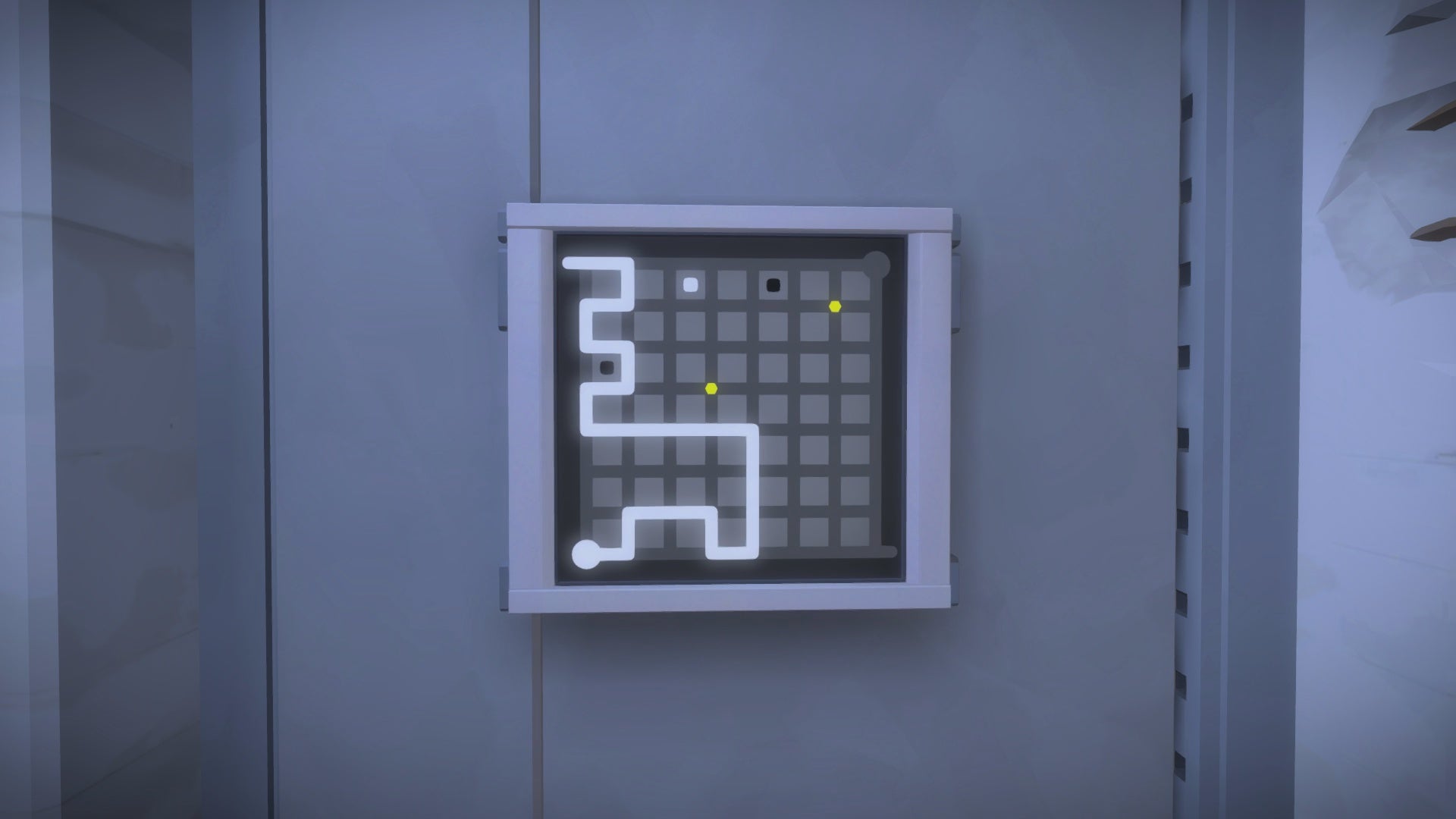 The first hexagon puzzle solution is found just after you exit the castle at the beginning of the game. As you follow the trail toward some early puzzles on the island, look for a solitary door on the left with a puzzle panel on the front. This panel features a segregation puzzle that contains white and black dotted tiles. The white dots can be hard to see, so feel free to check the solution below if you need help. Enter the room and draw the line on the podium box to reveal the first hexagon solution.
