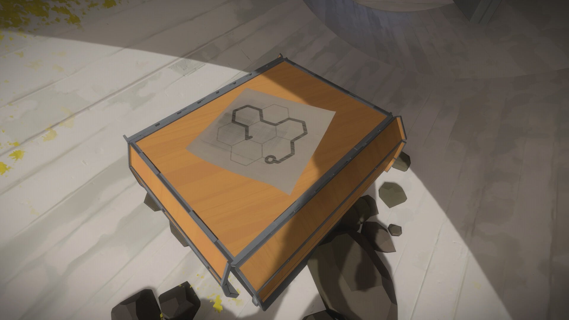 Solve the puzzle panel to open a hole in the cave wall nearby. This hole leads down a hallway to a chamber that contains a music box. Activate the switch on the music box to begin the Challenge puzzle series. When you successfully complete the Challenge, you will reach a room with a box inside containing the last hexagon solution. If you want to avoid the trouble of the Challenge, simply jot down the hexagon solution shown below.