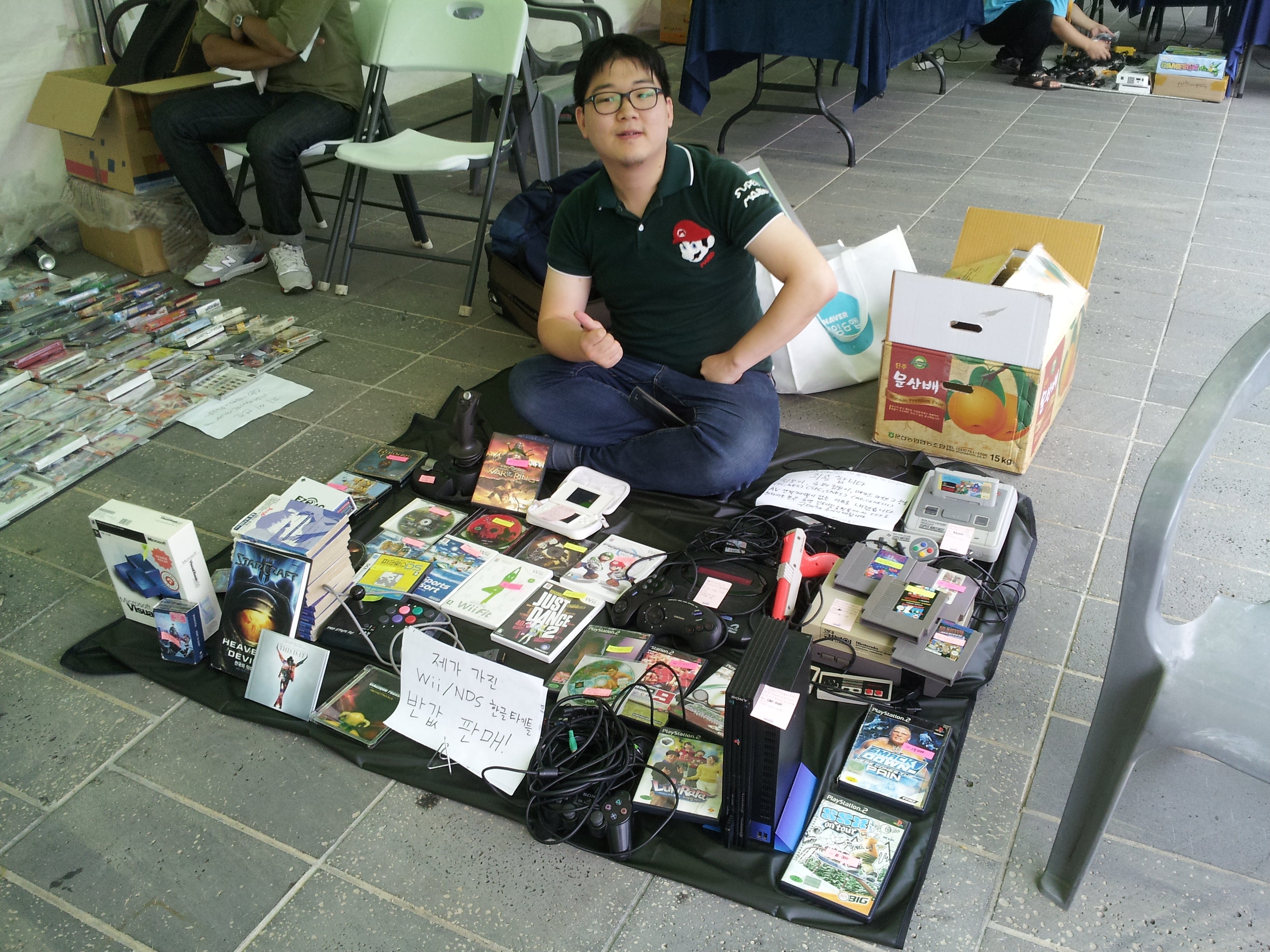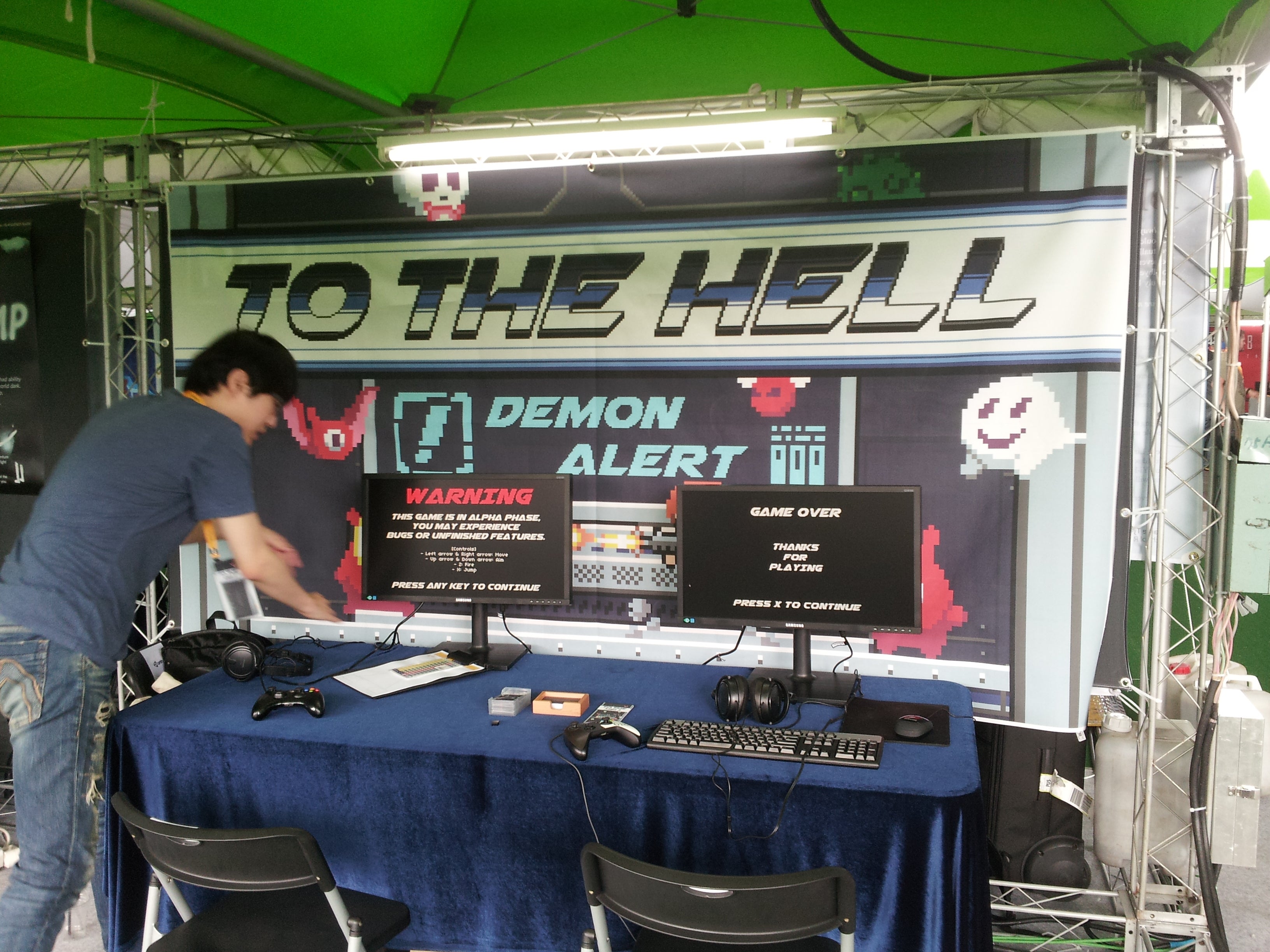After a lunch break gave us all a chance to visit the food trucks parked outside the exhibition space, it was time to see some games. This first day of BICFest was only open to exhibitors and invitees, so the developers took turns in groups playing games and showing their games to others. All the booths were outside under tents beneath the massive roof of the Busan Cinema Center, a welcome change from last year’s show which had developers standing in hallways lined with tables. That said, the outdoor locale made it easy for random pedestrians and even children to wander between tables. Even though this first day was not meant for the general public, I don’t think there were stringent checks at the gate given that BICFest does not charge an admission fee.