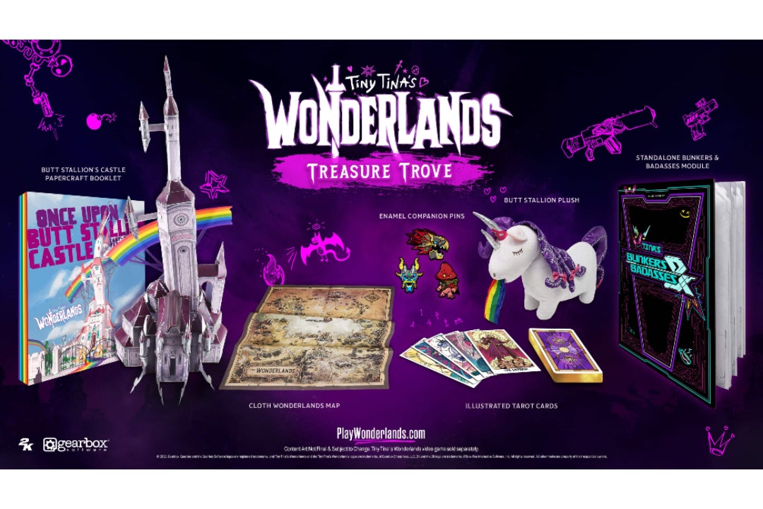 In the UK, you can get each edition of the game bundled with Tiny Tina's Wonderlands Treasure Trove exclusively from Game. The Treasure Trove contains a bundle of real-life items like enamel pins, illustrated tarot cards, and a cloth version of the game's map.