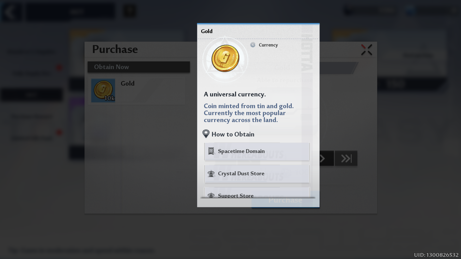 As you may have already guessed, Gold is the most popular currency in Tower of Fantasy. You will often earn it as a reward for all your various activities across the world, and it similarly can be used to purchase a lot of items too. If you're low on Gold for whatever reason, you can purchase 10,000 of it from the in-game shop in exchange for 100 Dark Crystals; we talk more about the crystals as a currency below!