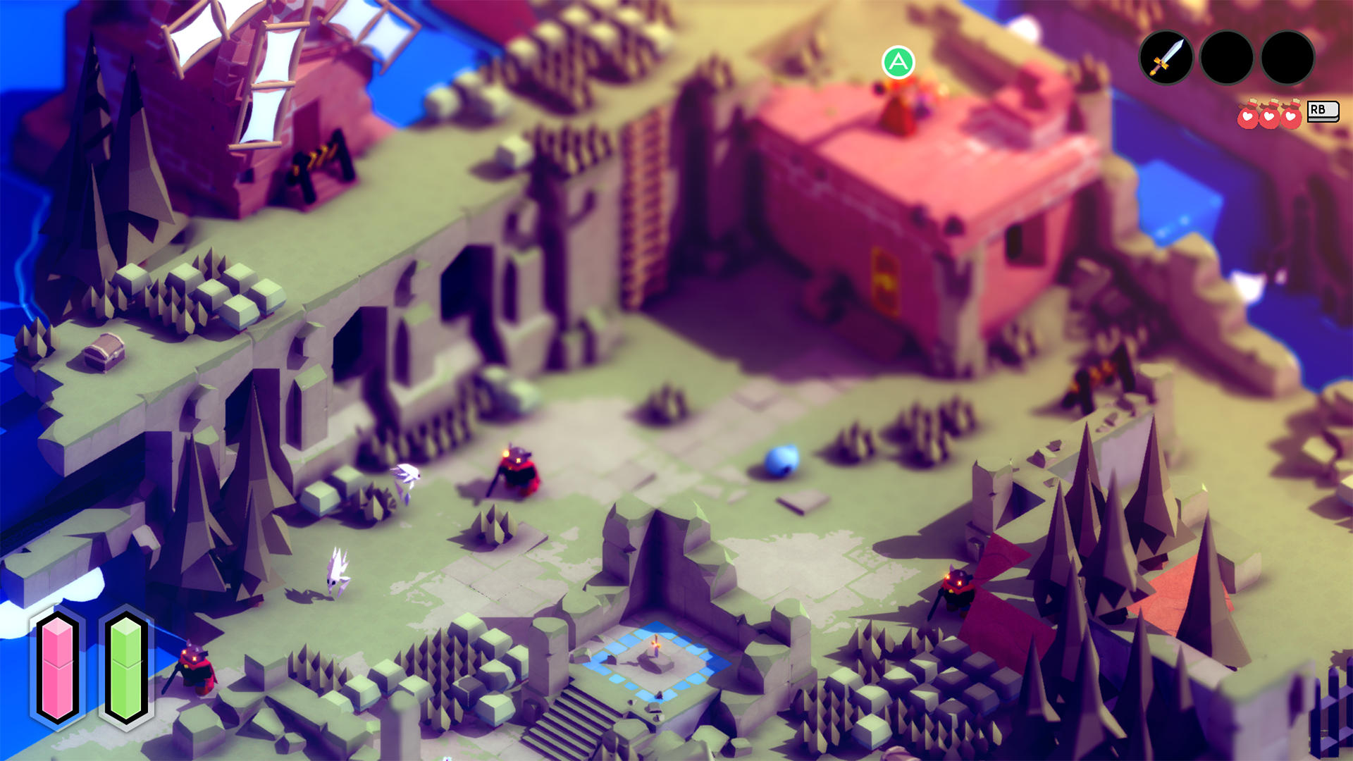 This means – even though you have access to most of the game’s curious mechanics from the off – you’ll either overlook how to do a lot of things or just bypass them entirely. Defeating an enemy atop an ancient tower, grabbing a manual page from its stash and realising ‘oh I could have been unlocking stuff since the start of the game if only I [redacted]’ should be irritating. But it’s not. It’s charming, and smart, and it makes you feel like the game gets one over on you (which is only fair, because if you sniff out very well-hidden passages and shortcuts in its gorgeous isometric world, you feel like you get one over on the game, too).