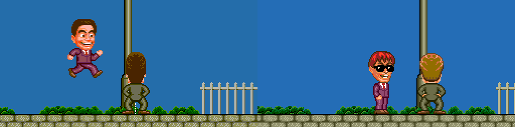The game was released in the US under the name of JJ & Jeff, sans rudeness. Tinkles were still taken, but there was no visible stream - just the character bobbing up and down in a way that left much to the imagination. A mask was used to cover the red, straining face of the person dropping an otter behind a bush, which made no sense in the general scheme of things. The least incongruous change was swapping out the original's rearward-firing, naturally produced, airborne toxic cloud for a forward-firing one that emitted from a spray can.