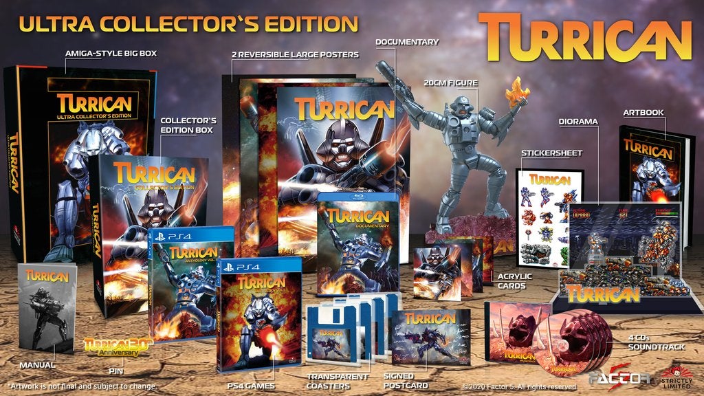 Factor 5 is making two Turrican Anthology collections, with five games each. They're both coming to PS4 and Switch, priced €35 each. Volume 1 includes Turrican (Amiga), Turrican 2 (Amiga), Super Turrican (SNES), Super Turrican Director's Cut (SNES), and Mega Turrican Score Attack (Mega Drive/Genesis).
