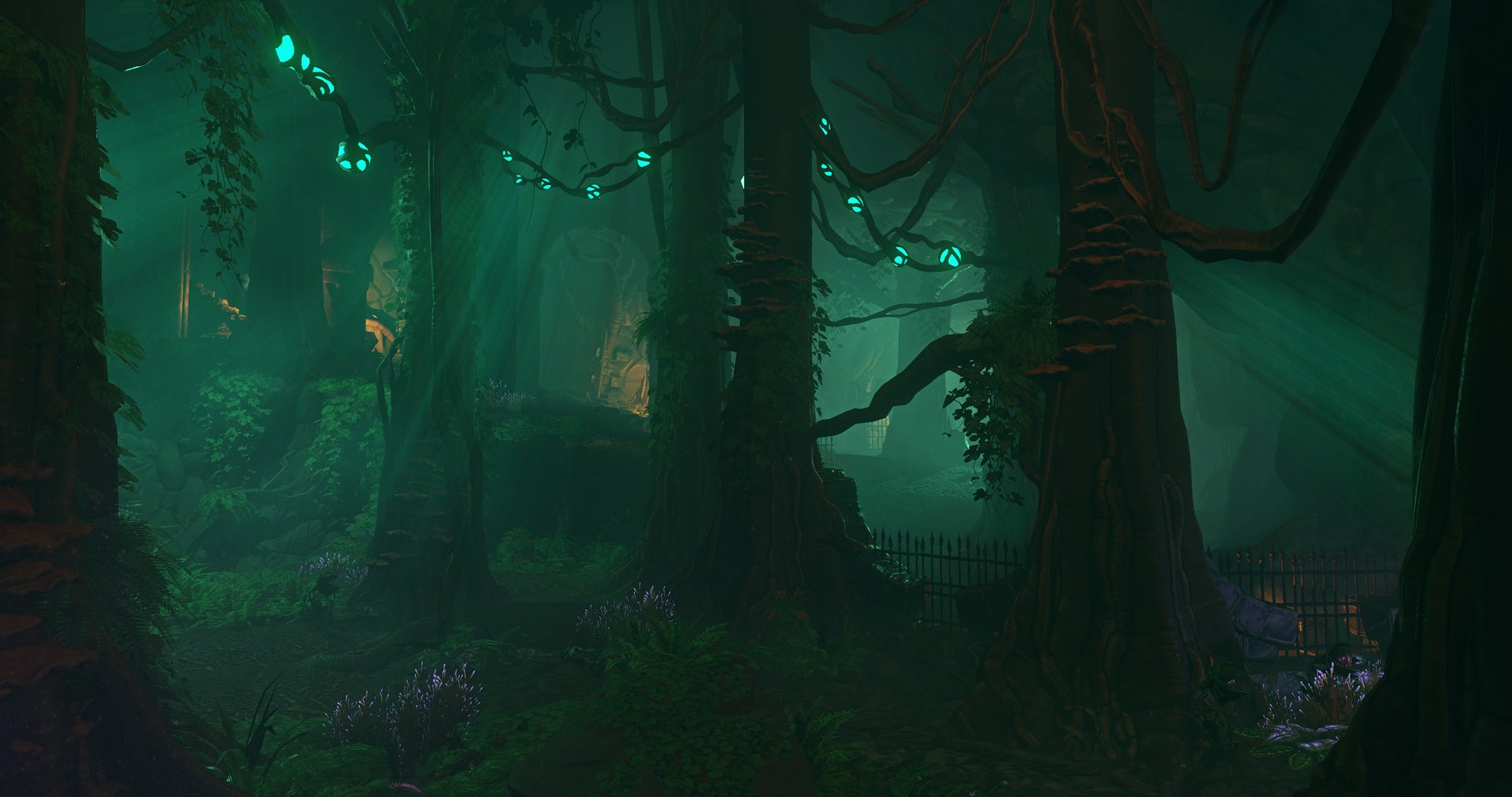 The area we're exploring in Underworld Ascendant an ancient one, full of ruins covered by twisting vines and glowing alien plant life. Torches light up the darkness, but they're also helped by the faint greenish glow that passes for sunlight down here. Rippers, living trees with swords for branches grow around the area; if you're not quiet and careful, they spring to life, destroying everything nearby. The Ripper's fruit is useful, as Deep Slugs eat it. Deep Slugs secrete trails of oil that can be burned, so if you throw some Ripper Fruit around, you can herd them in different directions and use them to literally light your way.