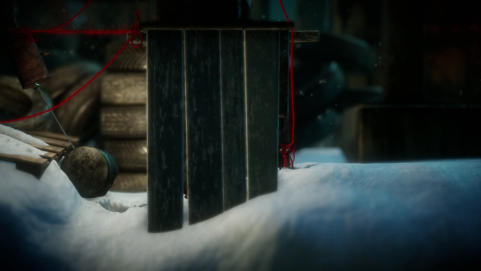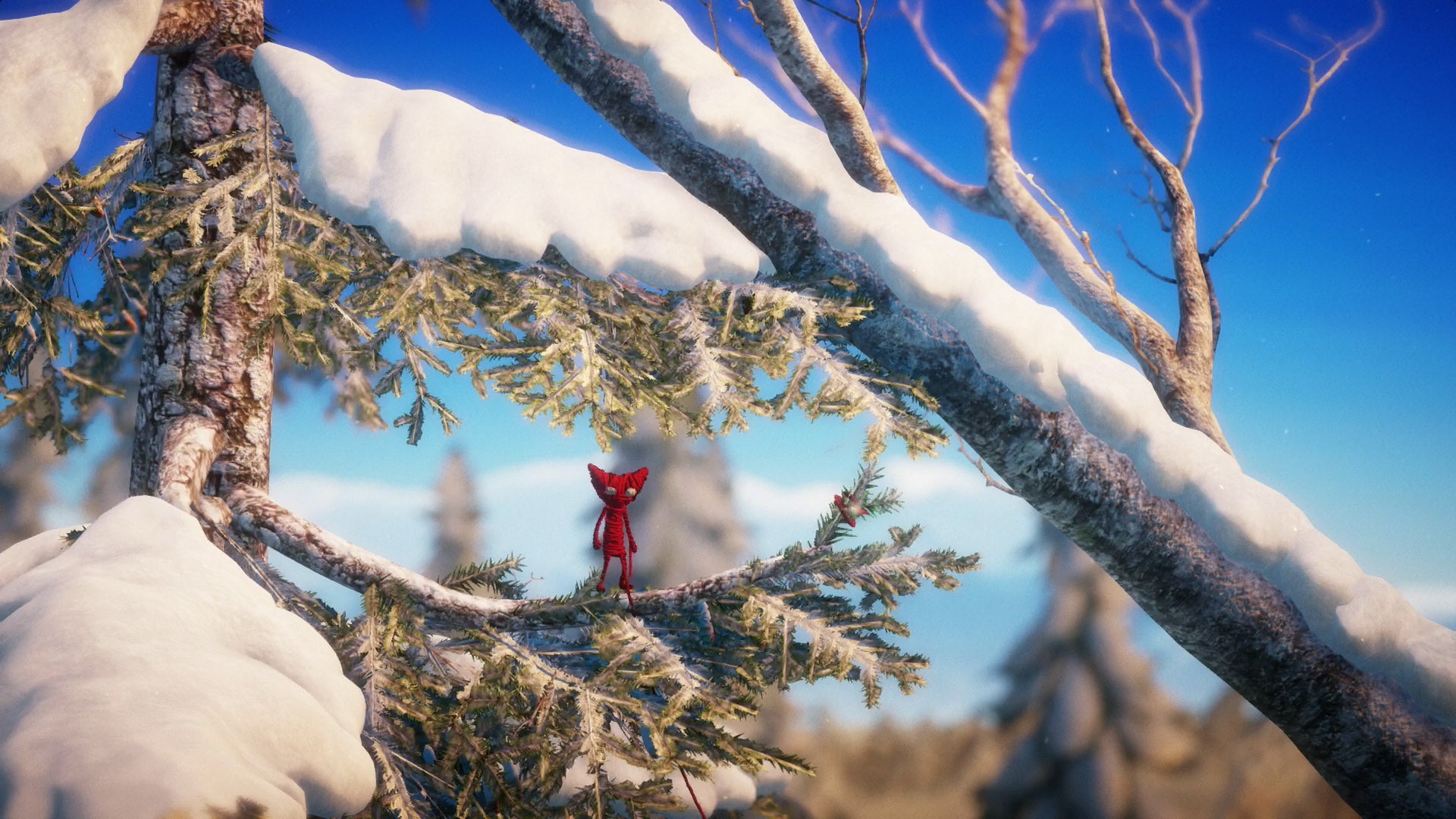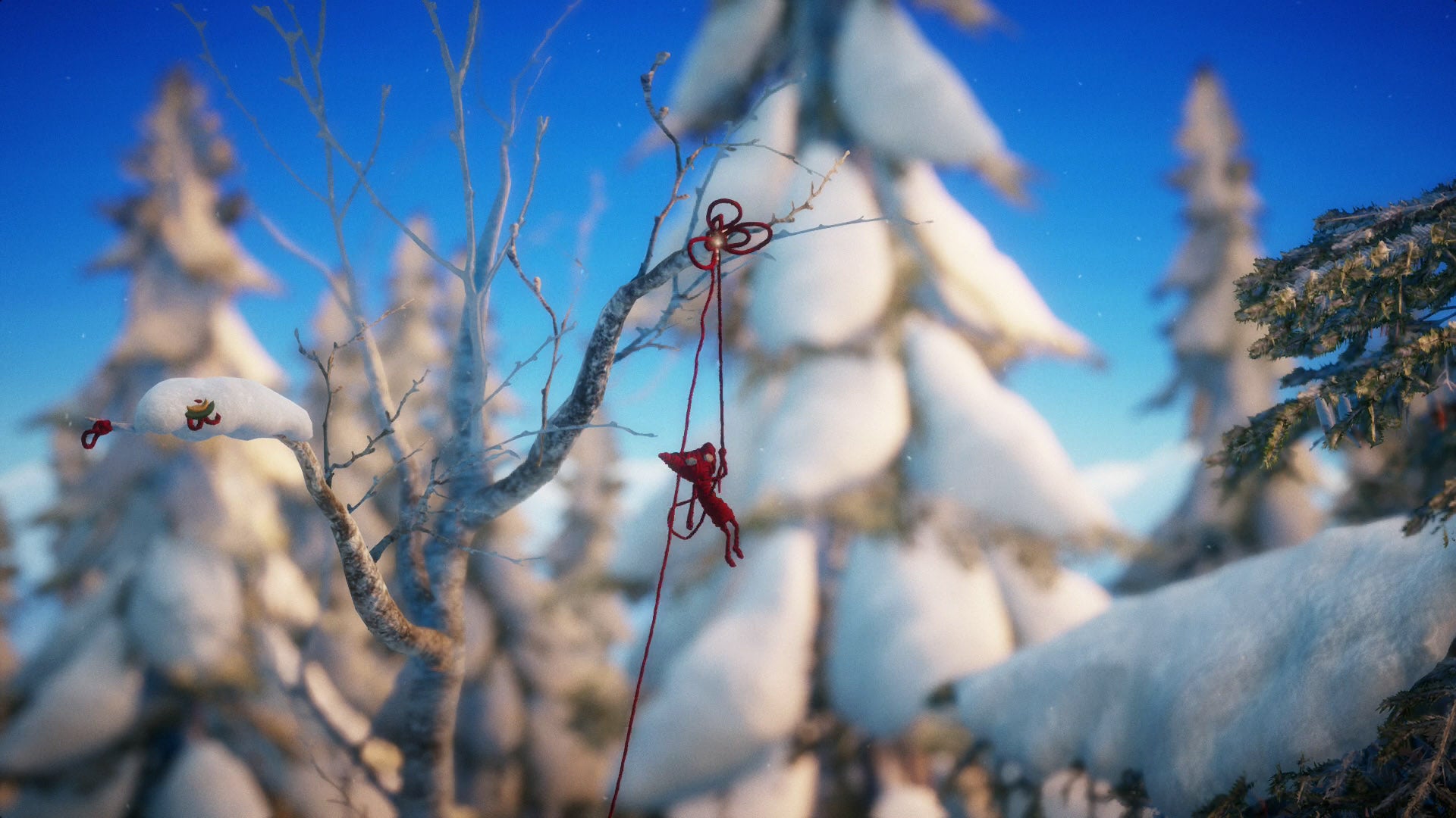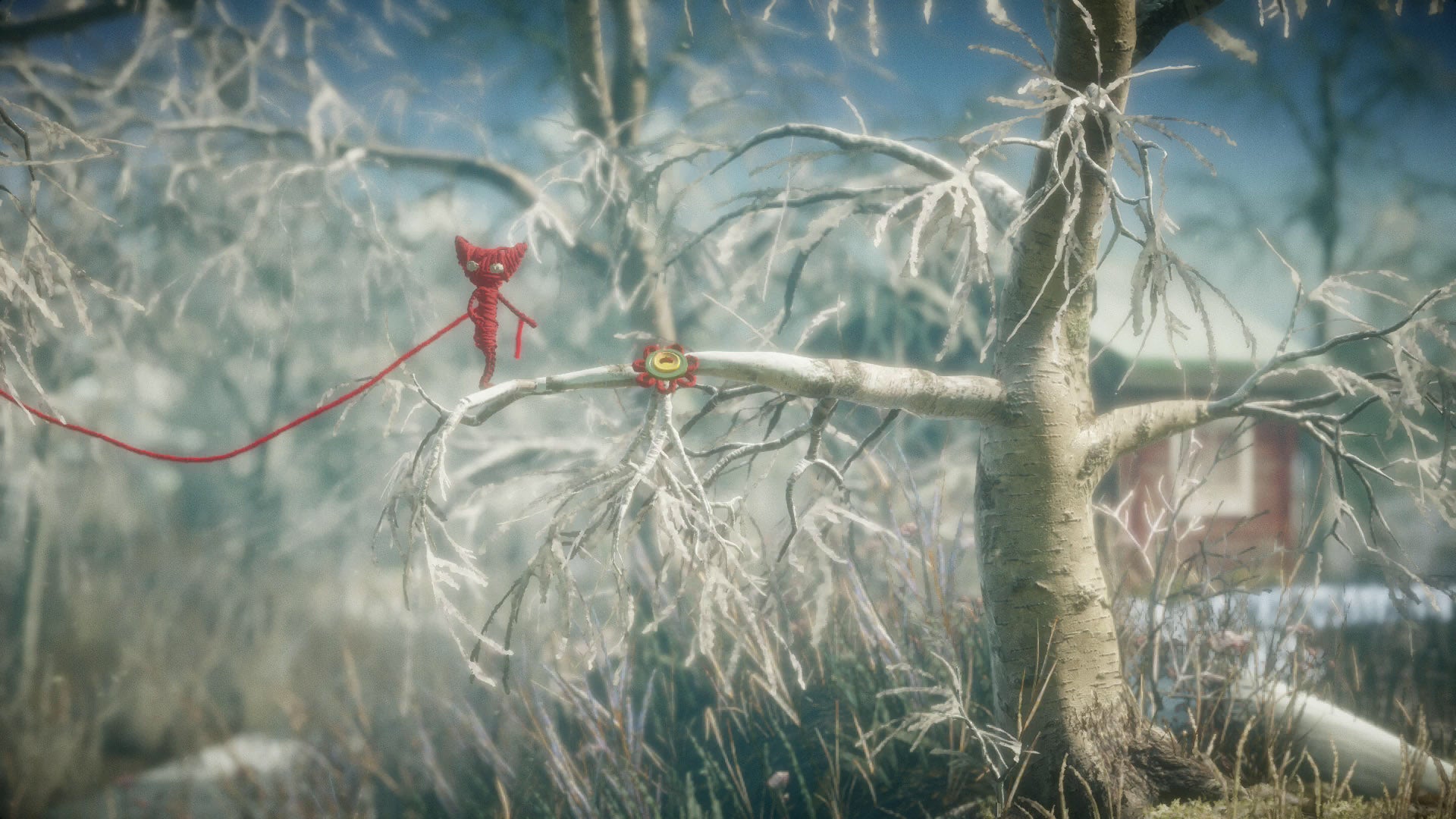 The first collectible of this chapter is hard to miss. As you walk on a branch shortly after beginning, you will be launched into the air. Grab onto an anchor point with your yarn, and notice that there is a secret sitting on another snow covered branch to your left. Swing and grab it.