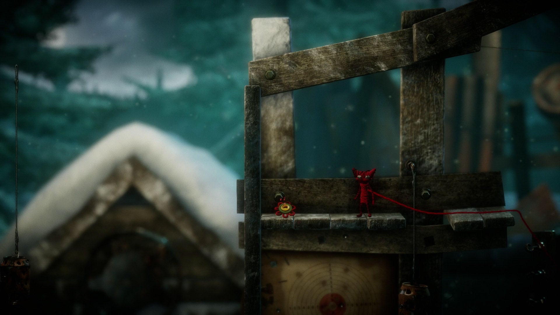 The first collectible of this level is found after heading inside from the snow. You’ll see a block on the ground, and you must build a series of yarn bridges that allow you to push the block up to the three lights. Climb up, then work your way to the far right to snag the secret, using the block for a boost.