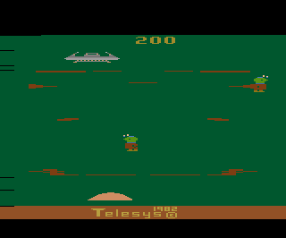 The act of abstraction could also work against a game's favor, though. To a very young person, most Atari games had a somewhat spooky quality because they tended to take place in an empty, inky void, and make all manner of terrible noises-mostly sounding like a Sega Genesis approximating a hair dryer-upon your death. The worst of these was Cosmic Creeps, and though the cover art portrays silly cartoon antics, nothing was as terrifying as those stalk-eyed aliens to three-year-old me. It wasn't necessarily my own death that made the game so scary: After completing the Frogger-like first portion of the game, you're tasked with blowing up aliens tailing some of your human friends. You fire on them from above, but you have to be careful, since a mistimed rocket could explode one of your poor allies-and the fact that you could do this absolutely haunted me.