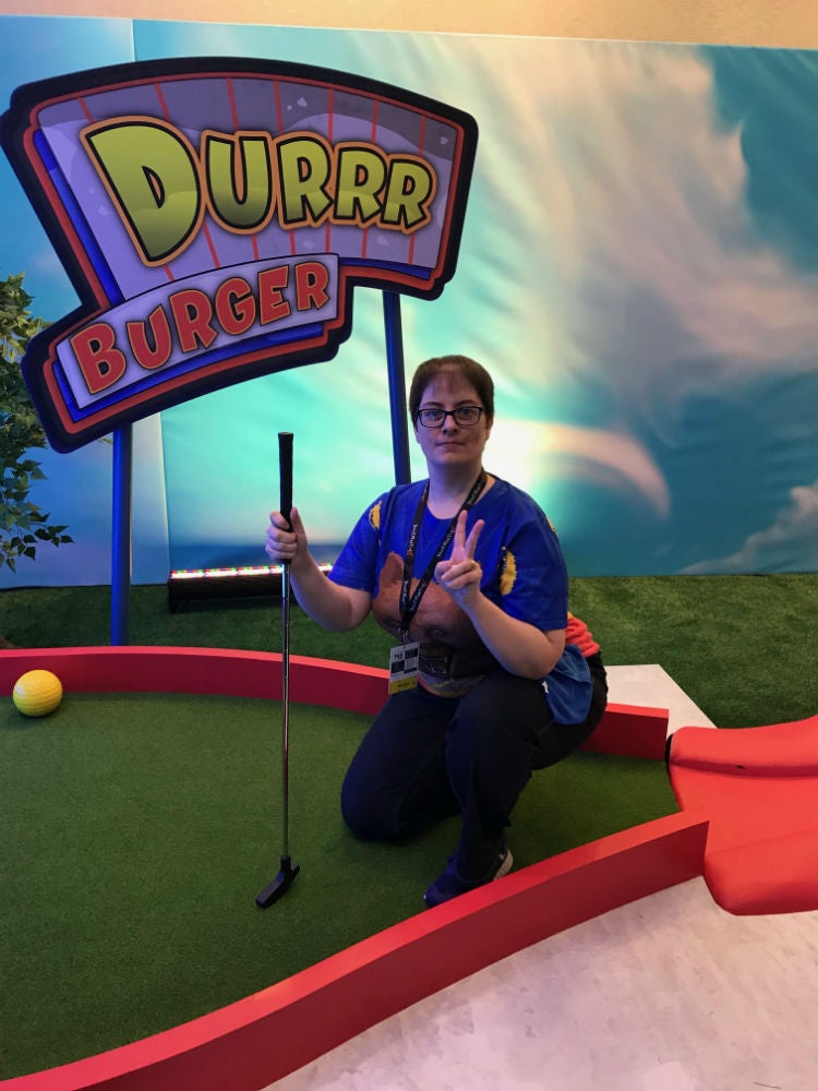 The highlight of the morning was our battle with Durr Burger. The herping-derping hamburger prop was part of the fifth hole, and as I mentioned above, you need to, uh, drag your ball along its tongue. It requires just the right amount of force. Mike, who had the lowest score before he went up against Officer Big Mac's regretful love child, lost his shirt. He walked away with something like 6 or 7 strokes.