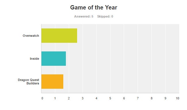 The nominees were evenly split between Overwatch and Dragon Quest Builders (plus Inside), but the majority of the staff decided to go with Blizzard's shooter for Game of the Year. And why not? Overwatch is just a delight to play. It's managed to bring back a huge number of fans who have felt alienated by multiplayer shooters, inspiring long nights pierced by promises of, "Just one more round." Overwatch is the refresh the genre needs after years of dominance by dreary military shooters like Call of Duty—a wonderful burst of color that is charming as it is deep. Blizzard has really created a winner with Overwatch; and while things can change, it wouldn't be a surprise to see it dominate the genre for the next five or even 10 years. It's for that reason (and many more) that Overwatch is our Game of the Year in 2016.