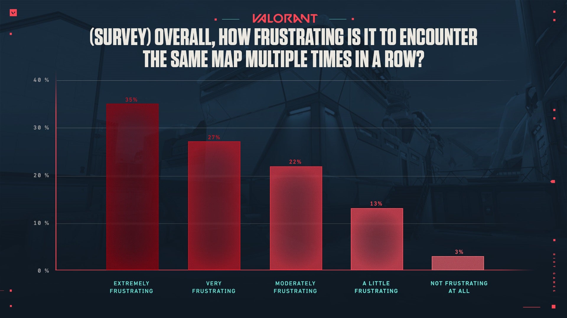 Back during Valorant’s launch, 26% of players stated they had run into the same map at least three times over the course of five games. Fast forward to patch 4.04 this March, almost two years since Valorant first launched and these numbers had apparently not changed significantly despite the addition of “pseudo-random” map selection.