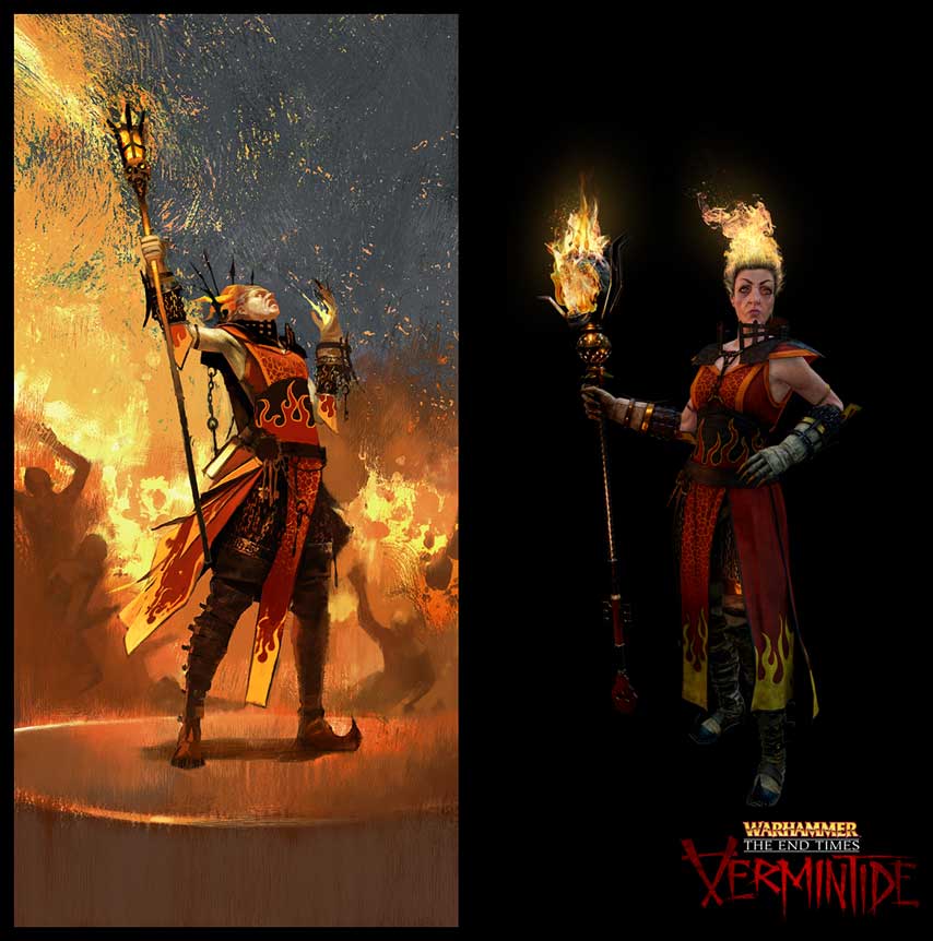 Nice. The rest of the blog goes further into Sienna's backstory, design aesthetic and gameplay, and you can find more details on the Bright Wizard including her arsenal of weapons on her Vermintide character hub page.