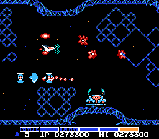 I don't mean to make it sound like you're totally helpless, here. You can shoot a couple of bullets at a time. Some enemies will drop little orange capsules when you shoot them (or more likely, successfully wipe out an entire formation of them), and you can collect these and save them up for spend them on power-ups. Each capsule you gather advances the power-up meter at the bottom of the screen by one step, and by building up a bank of capsules you can unlock new abilities like Speed Up (essential, but deadly if you overdo it), Missiles, Shields, and the invaluable Option.