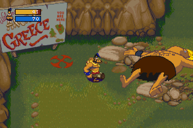 And the game was loads of fun, too. Is loads of fun. Either one or two players could go stomping through the world of Ancient Greece as one of three mythic heroes (Hercules, Jason of Argonauts fame, or Atlanta aka Atalanta). The top-down perspective revealed a largely nonlinear world akin to a Zelda game, with melee combat and plenty of dangerous monsters to contend with, including huge and intricately animated cyclopses. As might be expected from classic LucasArts, Herc's Adventure didn't take itself entirely seriously, with tons of visual gags (e.g. alien astronauts marauding around the feet of the Pyramids) and amusing anachronisms (e.g. gyros as health recovery items, because after all this is Greece).
