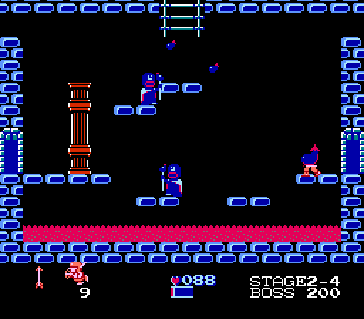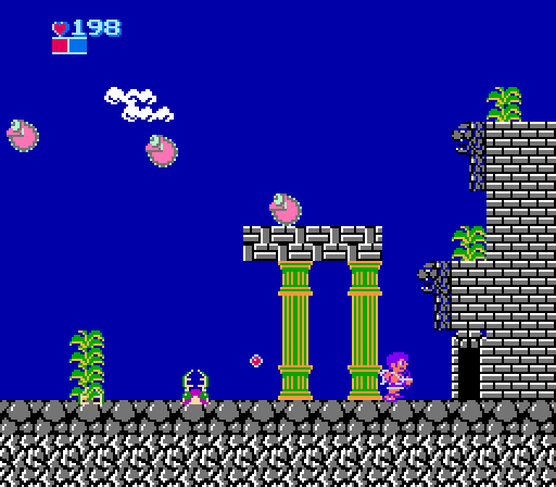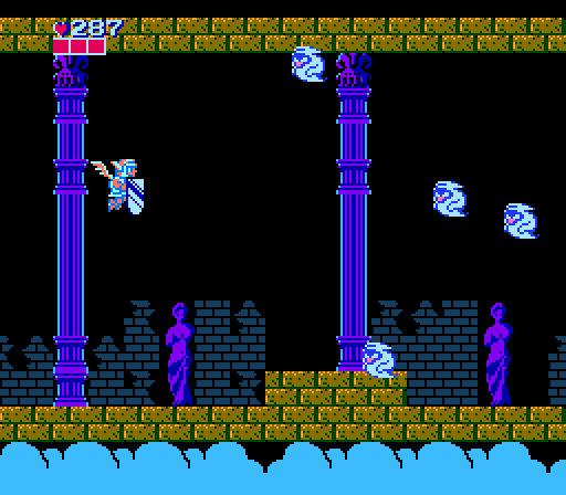 Amidst all those frustrations, Kid Icarus demonstrates some interesting ideas. Structurally, the game seems almost like one of those "deconstructed" meals where fancy chefs break a dish into its components and expects you to eat them individually. In this case, the dish being deconstructed is Metroid. Where that game featured a complex labyrinth of horizontal and vertical scrolling rooms, Kid Icarus separates these into three separate parts. You scroll up in some stages, right in others, and the only areas in which you can backtrack are the fortresses at the end of each world: Free-roaming screen-by-screen mazes.