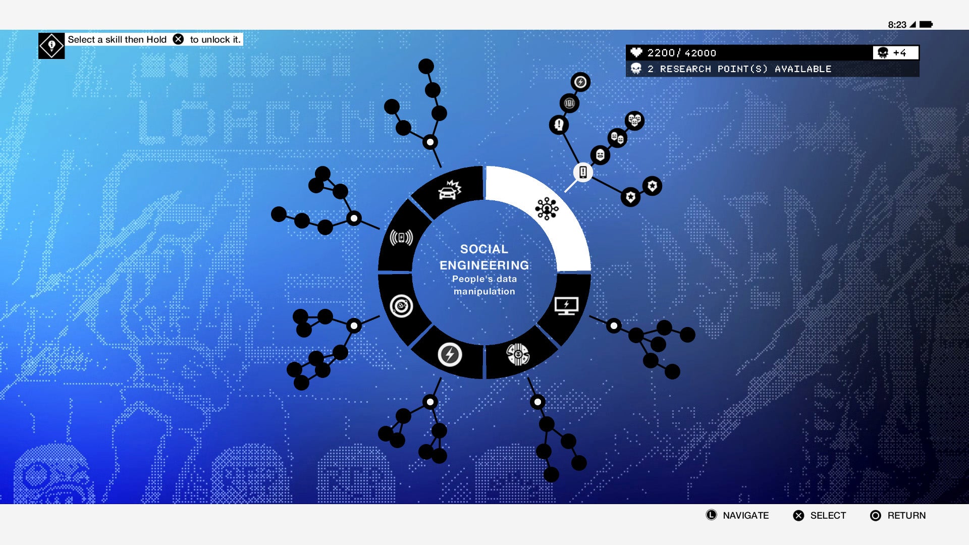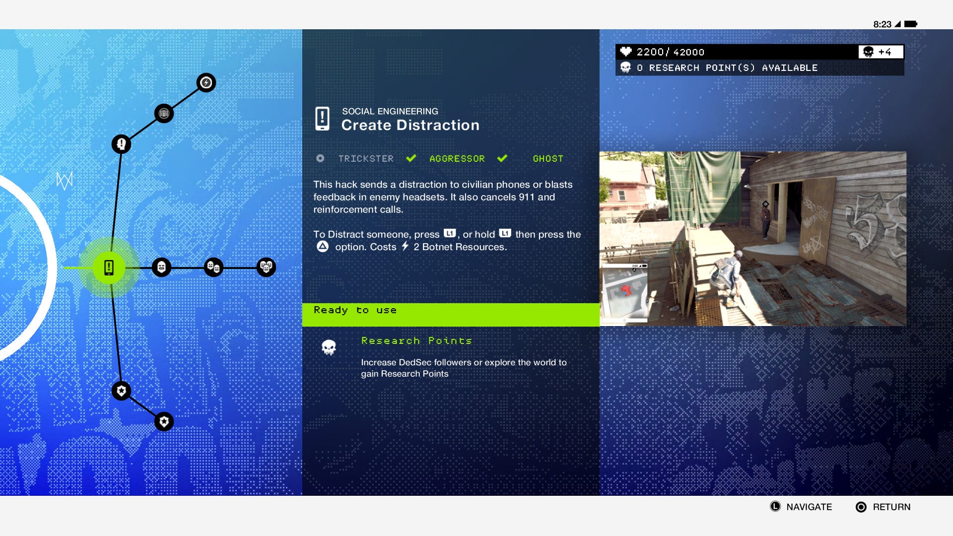 The real world is bright, but NetHack is grainy, grayscale view of the world that highlights useful objects in color. Blue objects are anything that you can hack, Red objects denote enemies and objects that are locked from hacking, and orange objects show you objectives and provide intel for new side missions. You can only use NetHack while on foot, so it pays to get out of the car when you ride into a new district of the city, just to see what's out there. Finishing missions increases the number of DedSec followers, which gives you Research Points to unlock new hacks.