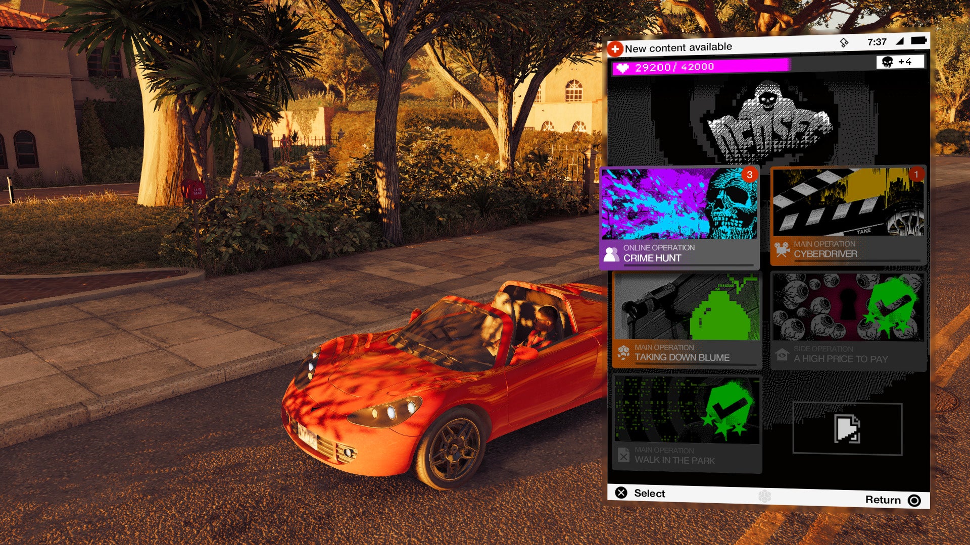 Since you no longer open up the map, the mission structure of Watch Dogs 2 had to adjust to compensate. Main operations, missions related directly to the game's critical path, are given to you automatically. The same is true of the online operations, which are system-generated missions that can be completed by yourself or with a co-op partner. Then there are side operations, which you find out in the world by using Watch Dogs 2's Detective Vision, the NetHack view.