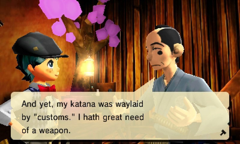But the game doesn't just pay tribute to clubs, swords, and axes. It tips its +1 cap at everything we've come to love and hate about RPGs, especially Japanese RPGs. The dialogue exchanges between Yuhan, Oyaji, and their customer base is often laugh-out-loud funny and references nearly every genre cliché you can think of. There are plenty of subtle jokes too, like a samurai-type character that speaks in old English. A nod to a certain "Mr. Thou" from Final Fantasy VI, perhaps?
