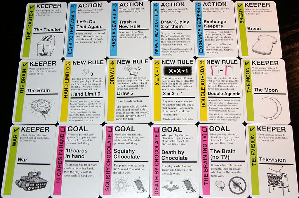 Fluxx is a card game whose main shtick is that its rules change as the game progresses. At the beginning of the game, you draw one card per turn, then play one, but there's no way to win. In order to win, someone must first play a "Goal" card that lists a victory condition, then someone around the table must meet that victory condition, usually by playing a certain combination of "Keepers" -- cards that remain in play in front of a player.